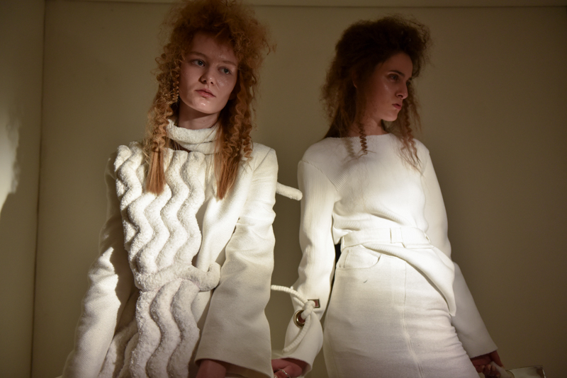 Parisian-born but London-based Faustine Steinmetz, presented an ode to 1970s shaping and silhouette, building upon her reputation for the hand-woven and hand-crafted. Deconstructed skirts and unravelled trouser waists, asymmetric woven polos and oversized wave woven scarves with retro flares and long jackets in mohair, soft cottons and towelling – and all hand-woven by the designer. Details of the clothing was intentionally visible, with welt pockets, trouser fly front fastenings, cutaway seams and thigh-high leg warmers, mohair and leather showed a move away from the signature denim seen at Faustine Steinmetz last season.