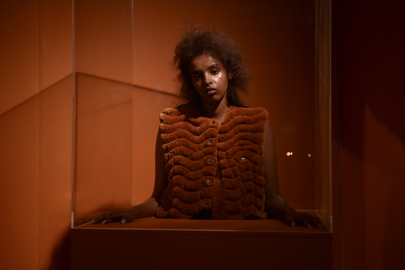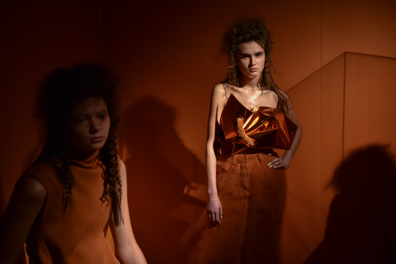 Themes of fun and play continued throughout the collection in oversized draped patent leather tops, giant eyelets with enormous pipe cleaner-esque belts and circular handles on patent metallic leather bags in gold and silver hues. The designer almost graphically grouped her palette – each colour mirroring the hue of the inside of the white cubes. These ranged from tribal rust orange, bright white, sunshine yellow, alabaster fawn and a beautiful teal. Hair was wild, back-combed and crimped, further emphasising the primal, wild and fun.