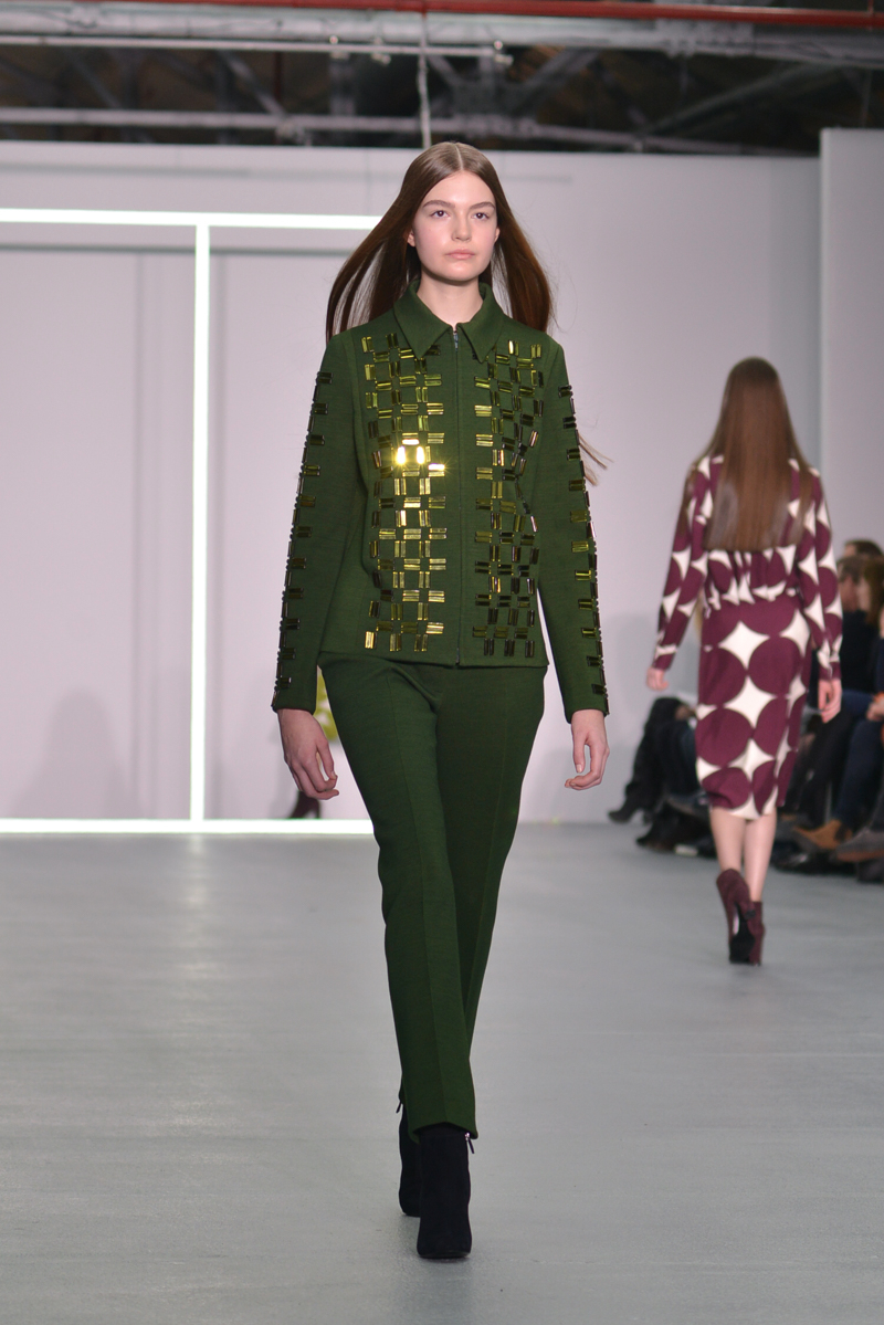 This influence created pieces with a masculine touch for overcoats and jackets with tailored shirts and dresses split front, back and side. The architectural patterns imitated geometry created into graphics that brought out the dark greens patch pockets, bindings and epaulettes laid out on each creation.