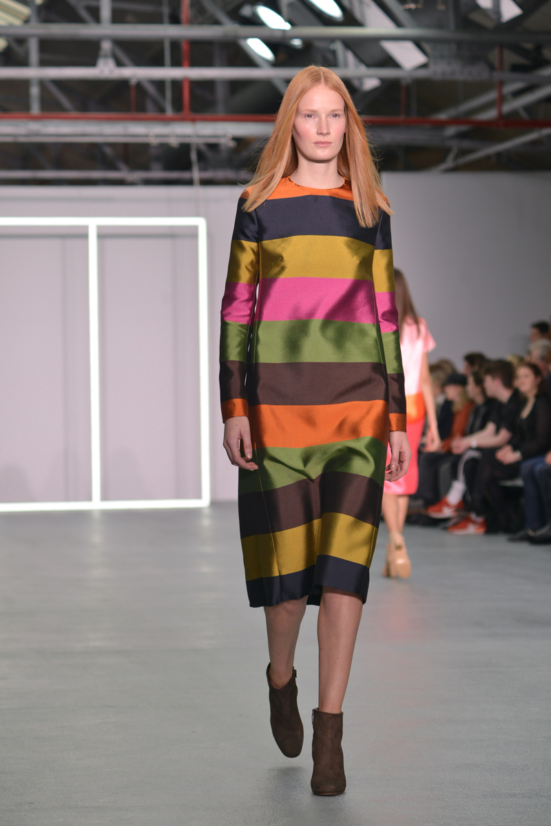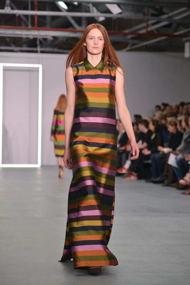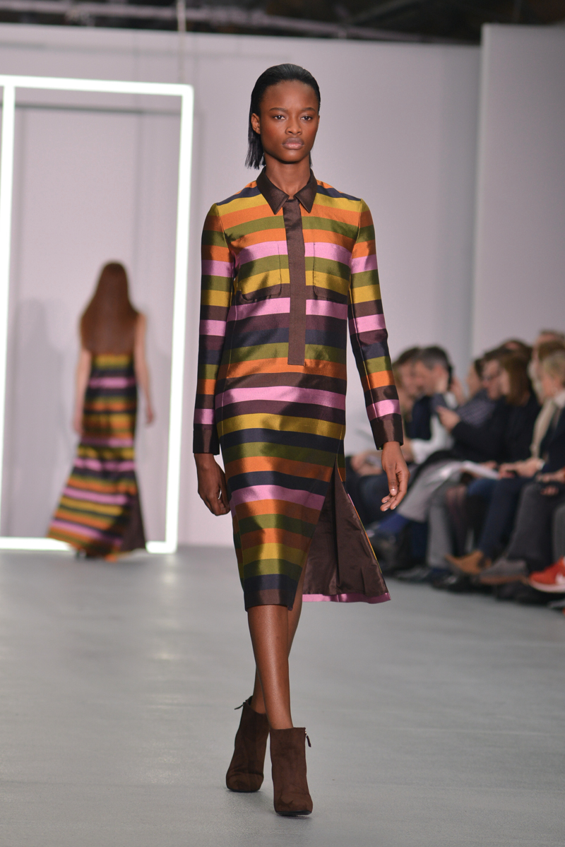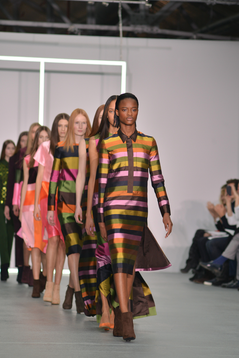 Later on, some dresses had the summer touch with the flamboyant colours and smart tailoring; this set of dresses would be perfect even before autumn/winter 2016! The influence of bold colours is an inspiration many should take, and the dresses that appeared later in the collection were bursting with autumnal hues and added fun loving crayola striped brights.