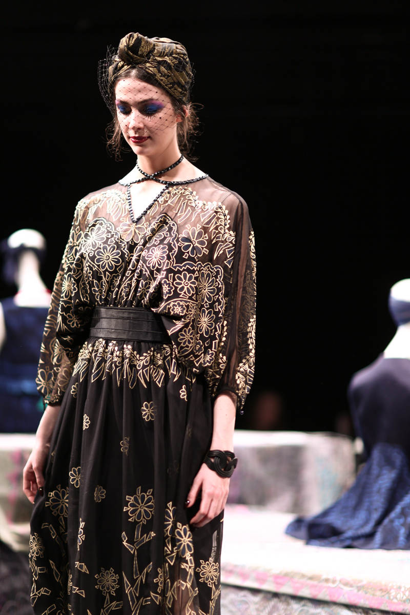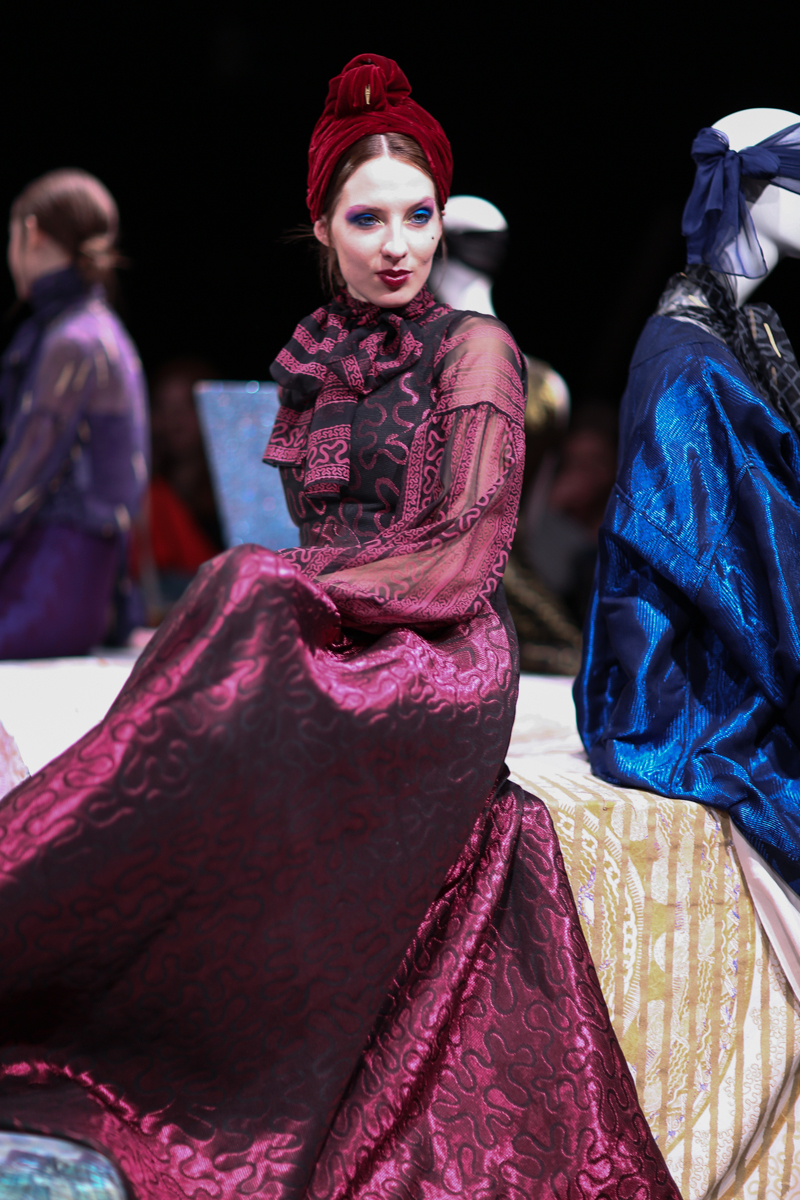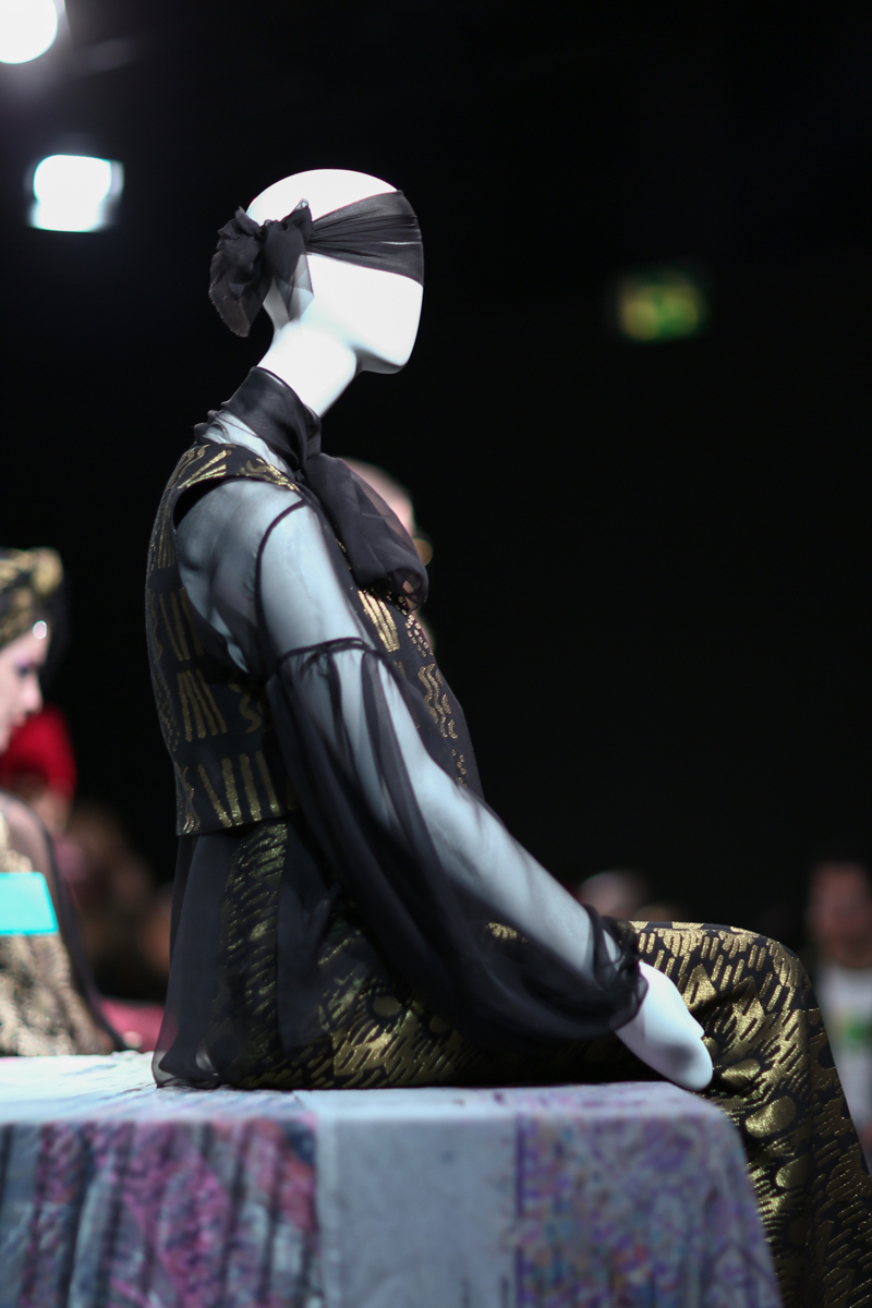 Staged at the BFC Presentation Space, Rhodes displayed her new line in a relaxed social event. With her collection placed in the centre, models and manikins exhibited her pieces, with a bohemian manipulated Malaysian dance showcasing the ease and freedom of the clothing.