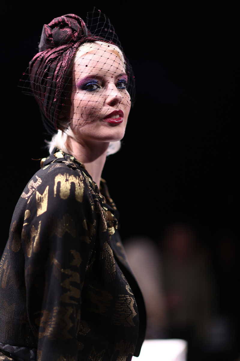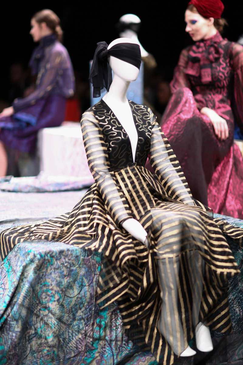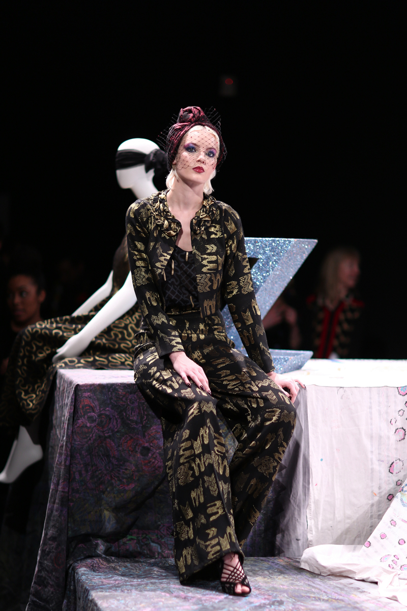 The second half of her collection, complimenting the experiential with classic, displayed gold evening dresses cut to flatter the female form. Silk chiffon flowed as the models moved sinuously around the platform. Two-piece suits with wide legged trousers and cropped jackets broke from the traditionally feminine cut demonstrated through out the rest of the line, refreshingly showcasing Rhodes’ signature graphics.