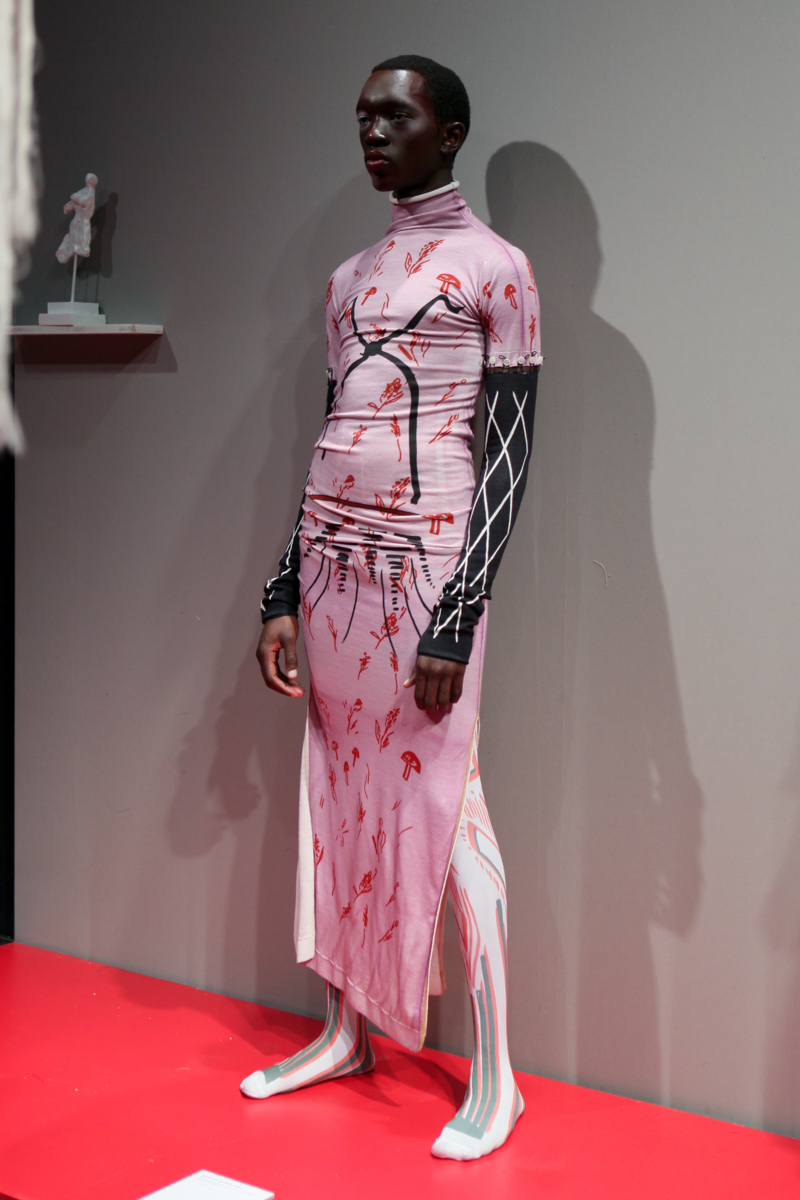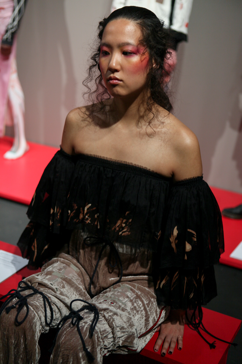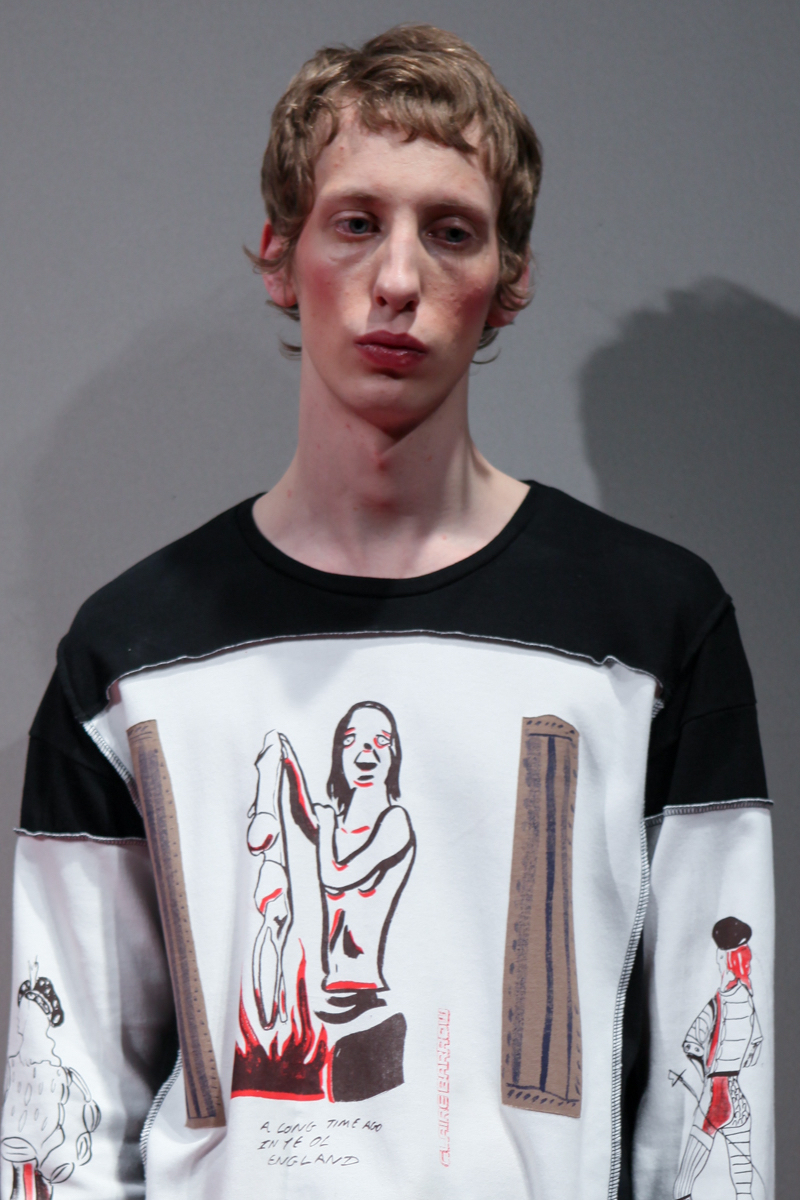 The museum idea of documenting was extended with each garment containing a description, year, and accreditation whilst alongside a series of three films which were intriguing in themselves; collaborations with artist Liv Fontaine, prodigious directorial talent of 13-year-old Duke Brooks and photographer Alice Neale. Barrow highlighted the postmodern concerns of nostalgia and blatant pastiche, by knowingly upturning them to comment on the constant regurgitation and direct references used from subcultures of different fashion eras, so prevalent within visual culture today.