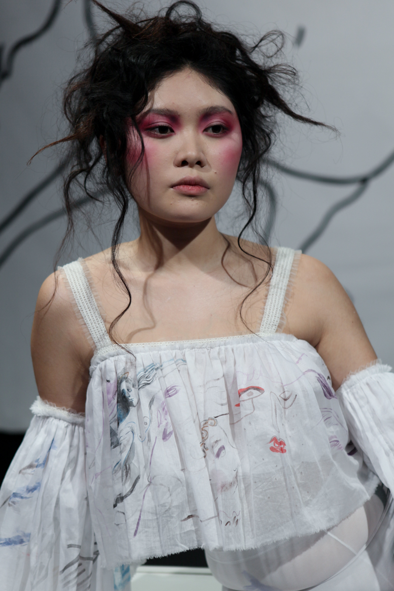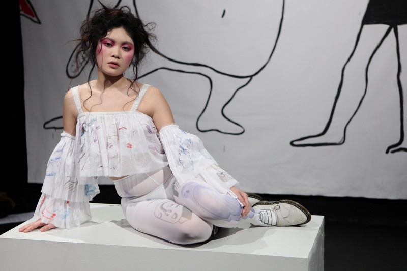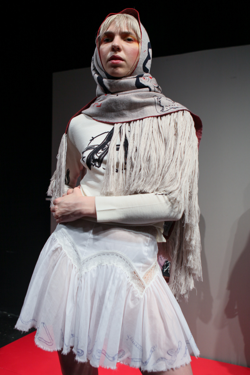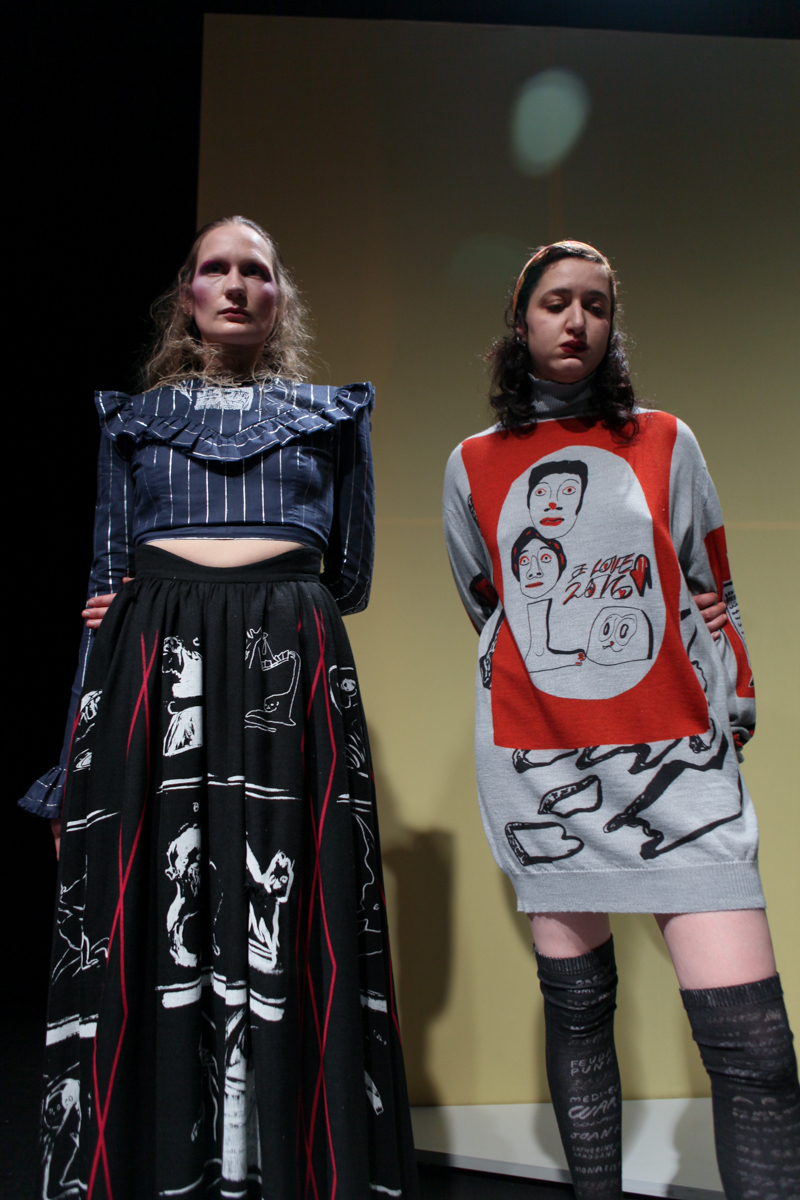By using a multiplicity and bricolage approach, Barrow borrowed and recreated 80s and 90s shapes and fabrics to form her aesthetic. Frills at necklines and oversized at sleeves of gypsy, batwing cotton tops, taupe velvet flares, huge tent-like canvas hand-painted dresses and a standout pink polo sweater with asymmetric gathers filled the room. Leggings and oversized sporty jersey jumpers were emblazoned repetitively with her signature illustrative prints daubed. The scent of lavender and rosemary by Agraria, dirty Doc Martens-style white sandals and a soundtrack of Spice Girls’ Viva Forever and Mysterious Times by Sash! further emphasised perhaps even a longing for childhood or the past.