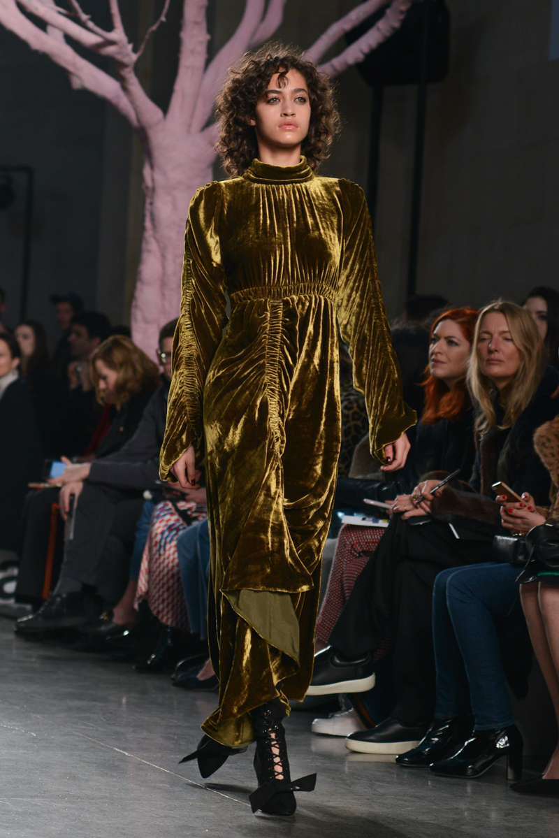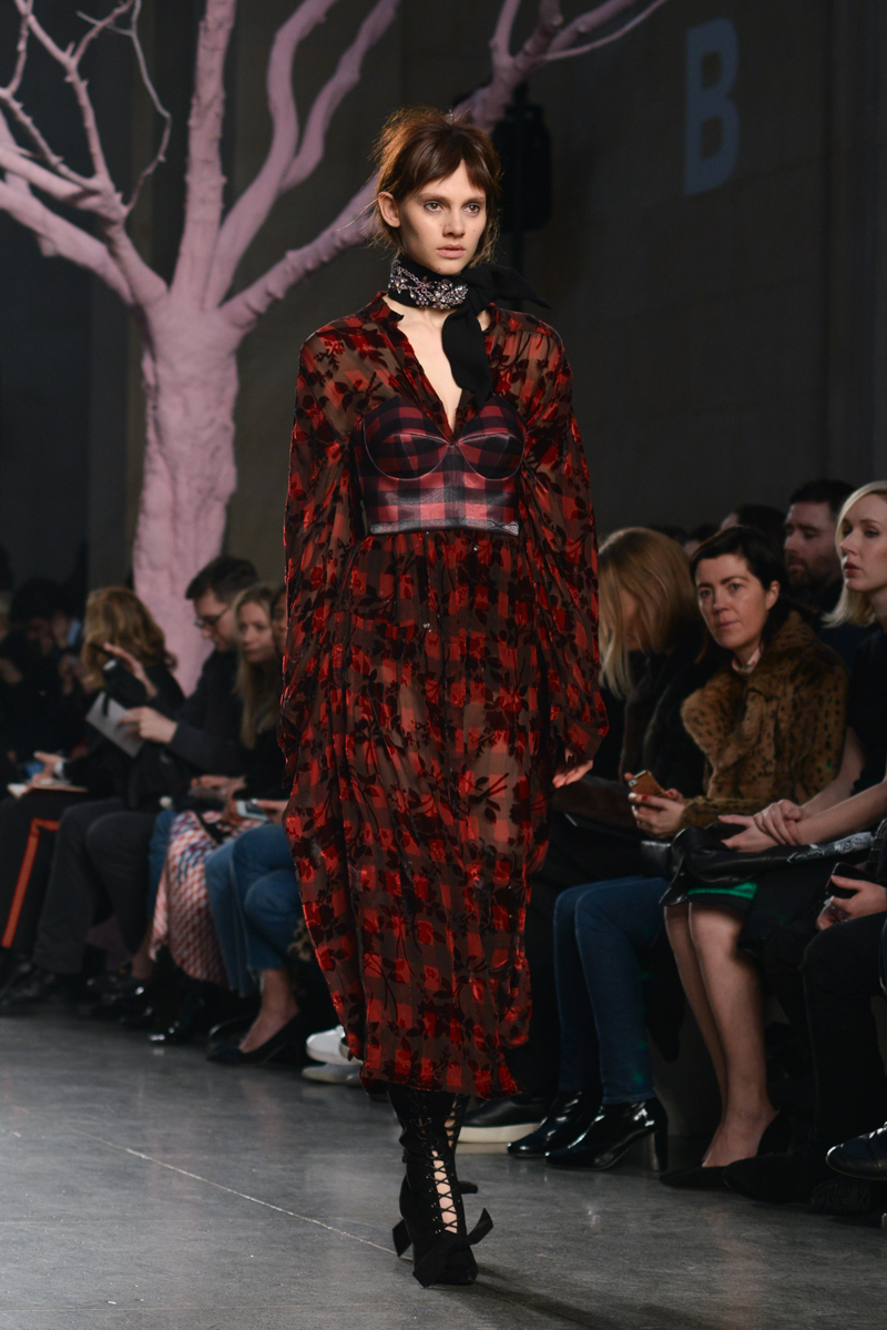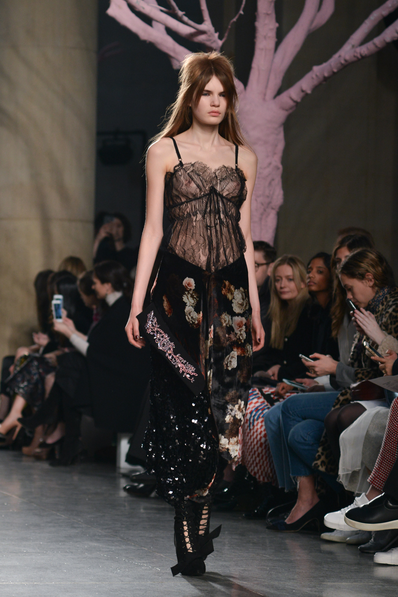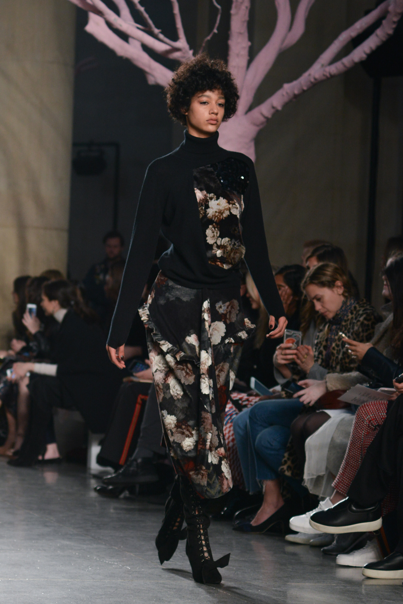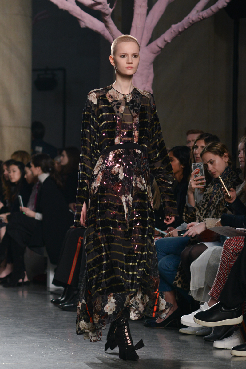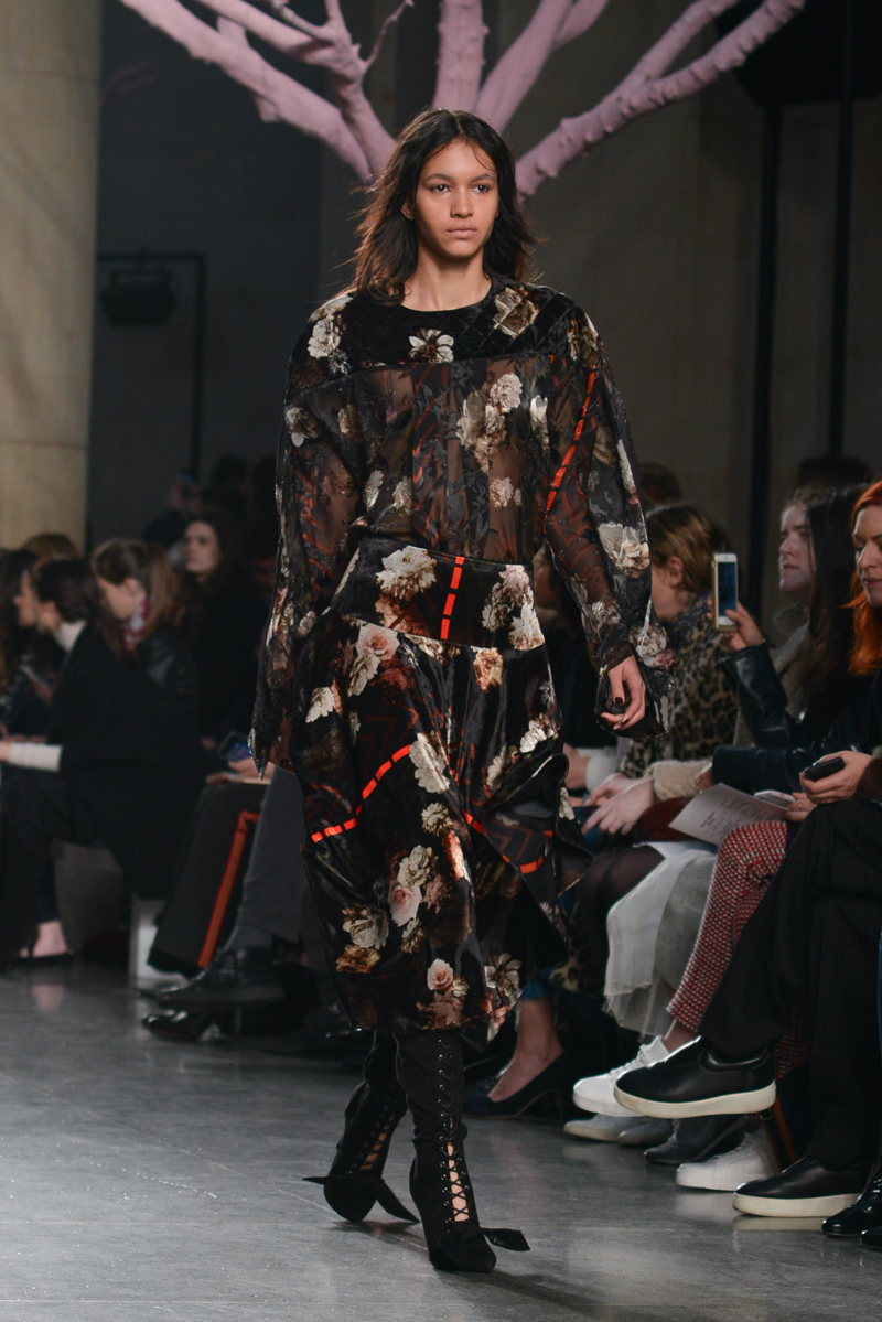 Preen by Thornton Bregazzi presented a glamorous autumn/winter 2016 collection at Topshop Show Space for London Fashion Week. The new looks were dark florals and layered fabrics. Here are our images from the show.