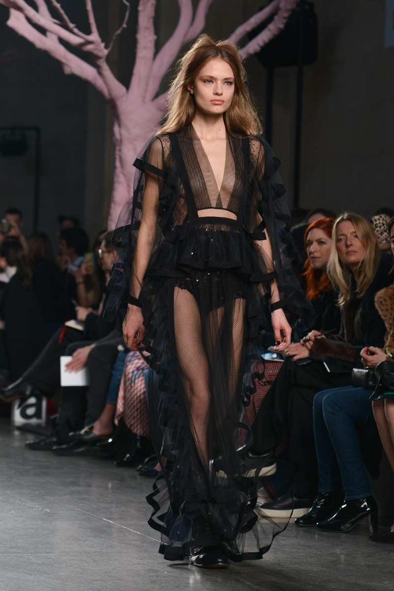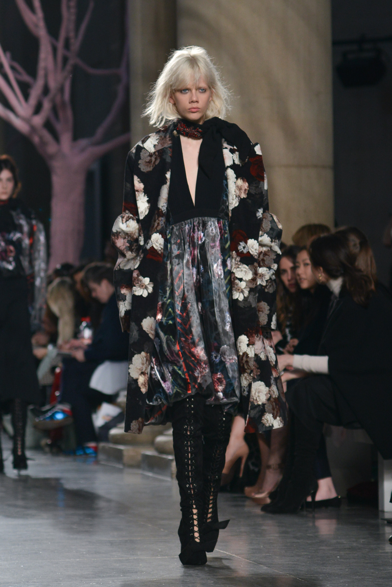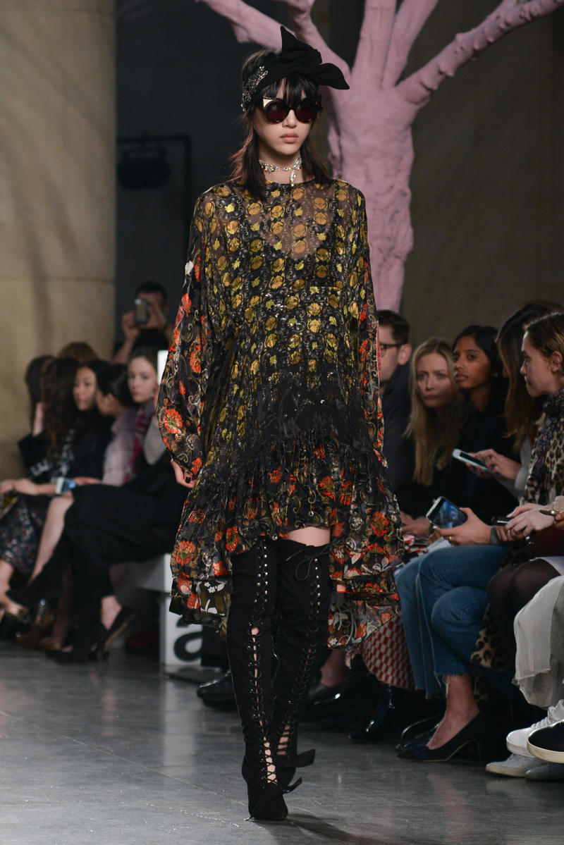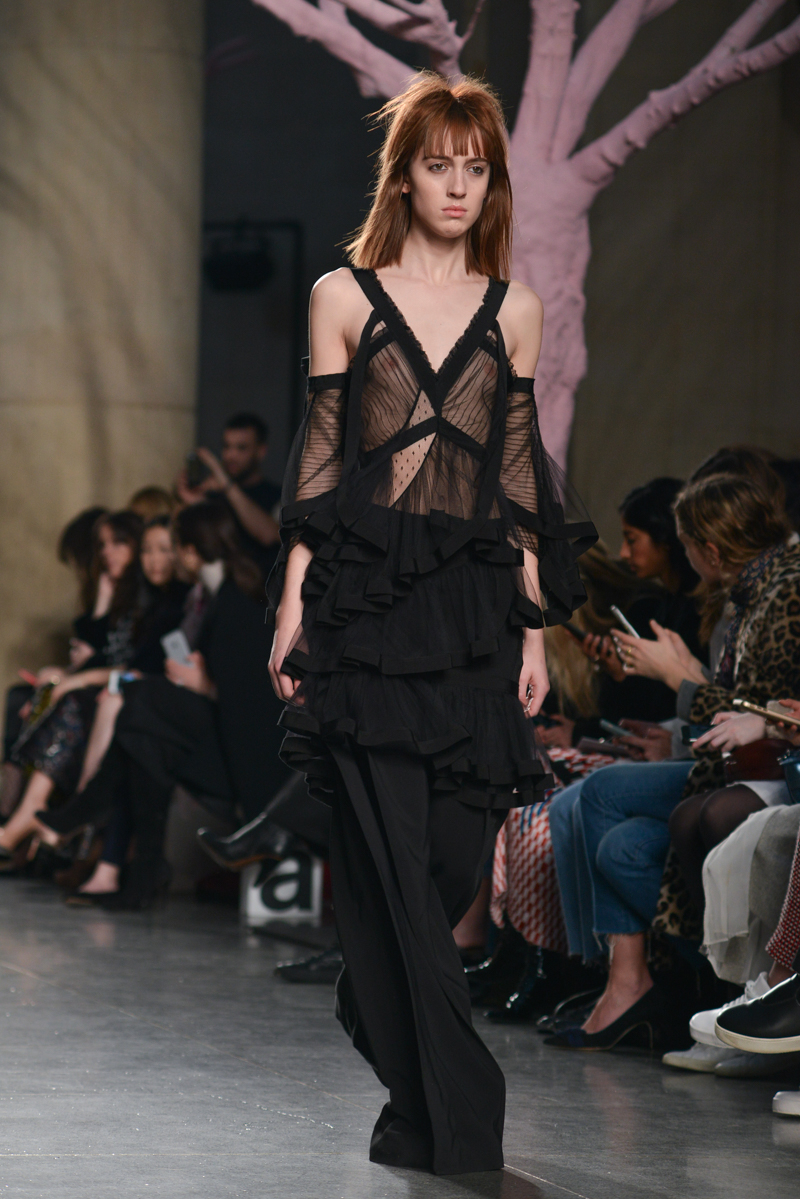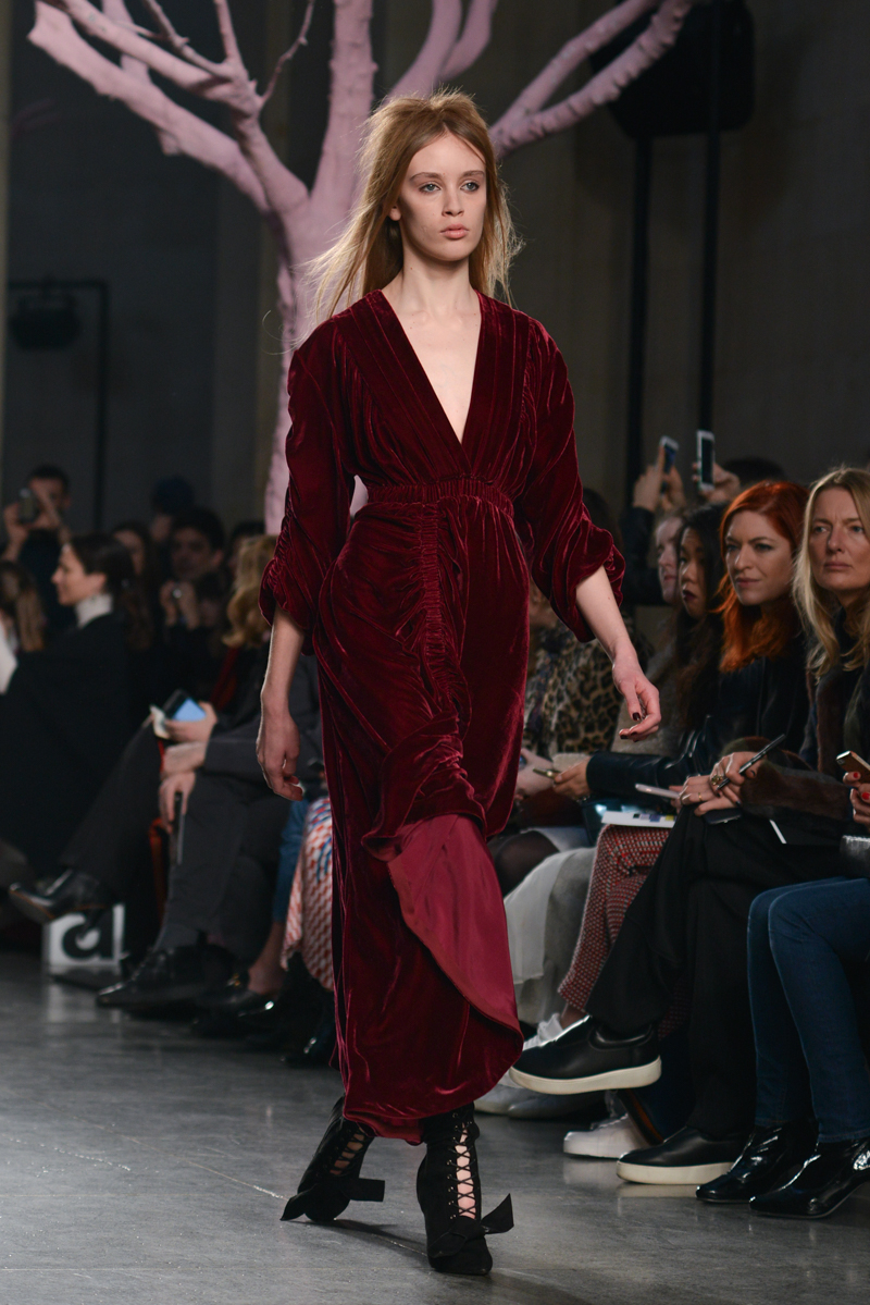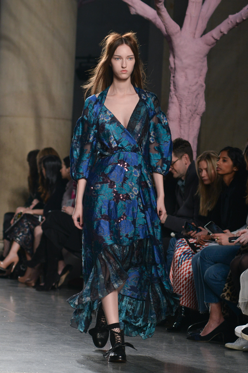 Preen by Thornton Bregazzi presented a glamorous autumn/winter 2016 collection at Topshop Show Space for London Fashion Week. The new looks were dark florals and layered fabrics. Here are our images from the show.