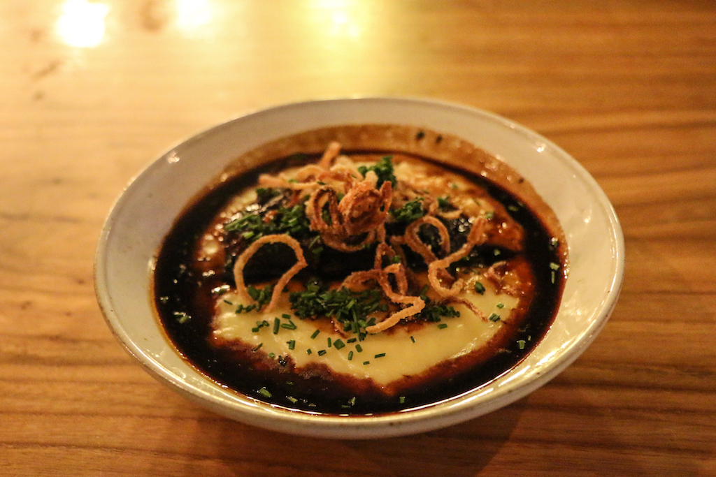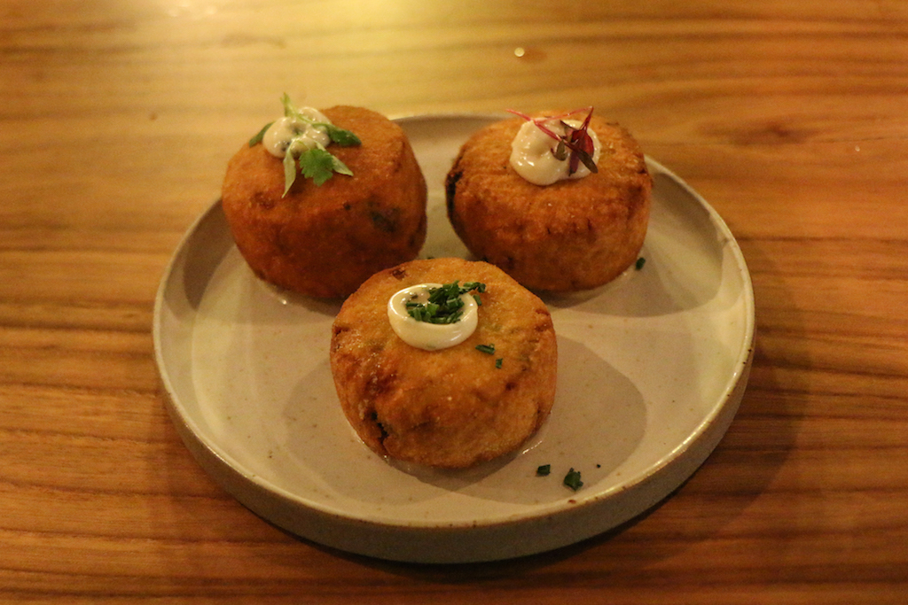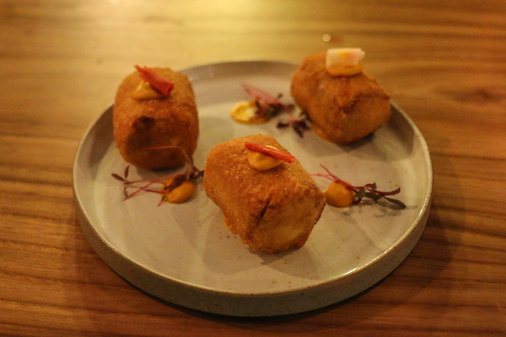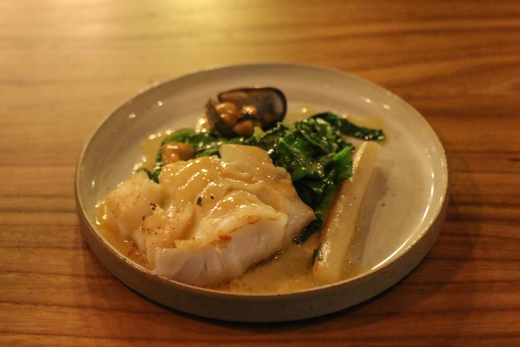 The food is a selection of small sharing plates, such as Beef Chips and the Meat Board, and more substantial ones such as Beef Cheeks, Smoked Mash, Crispy Shallots; Cornish Cod, Salsify, Greens, Cider Sauce, Mussels or Colcannon, Ragstone, Basil.