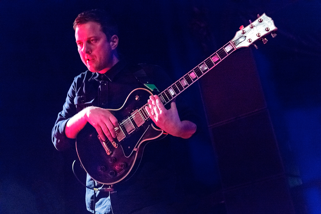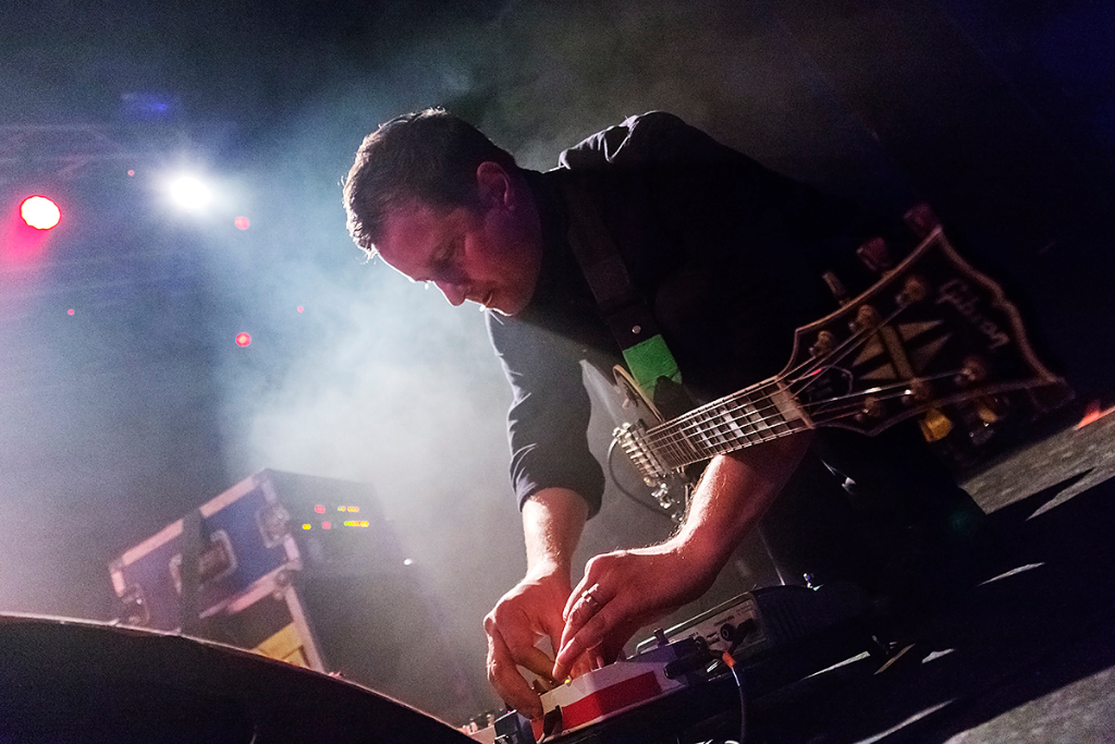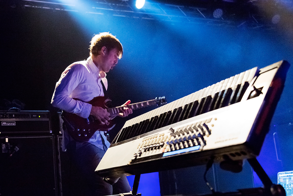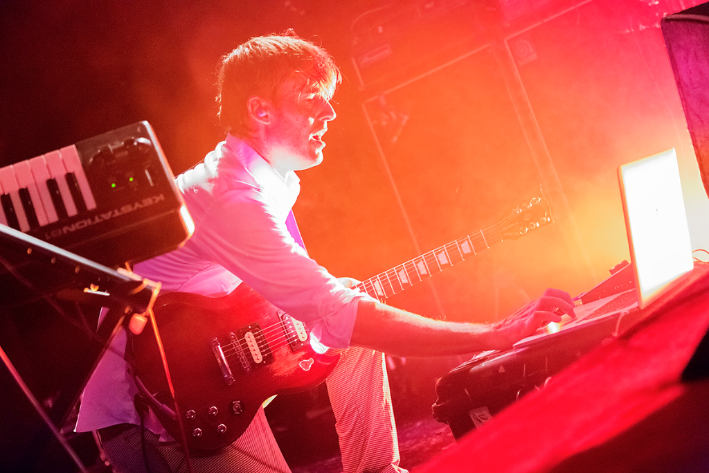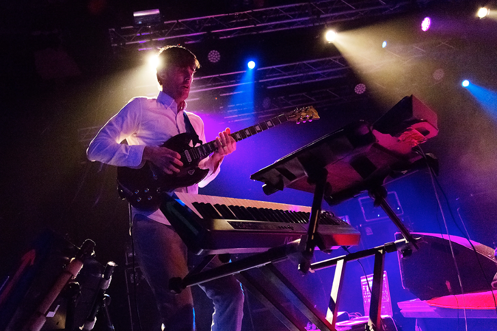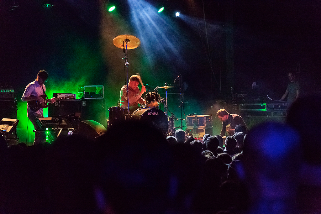 Slowly easing the audience into the music, Battles played their famous opening song Dot Com, starting with Ian Williams’ chords and systematic melodies on the keys, and the occasional dirty strums of Dave Konopka’s guitar. The crowd were already captivated, nodding their heads to the methodical beat. Cheering enveloped the intimate room as acclaimed drummer John Stanier took to the stage. Each and every heavy kick and dynamic hit trembled across the venue, filling everybody with an urge to dance.