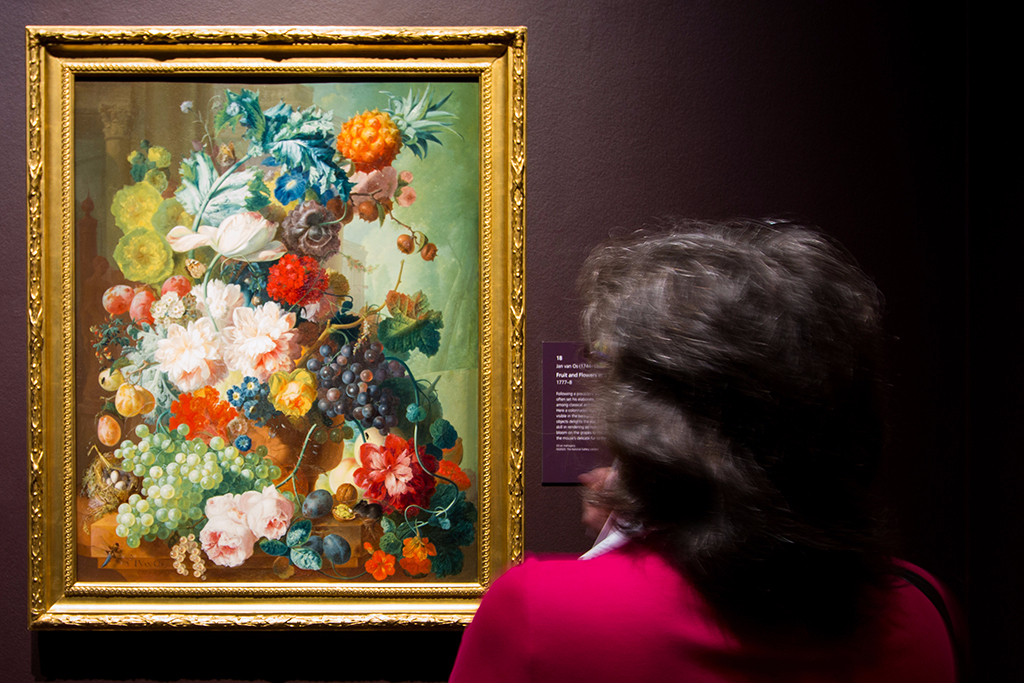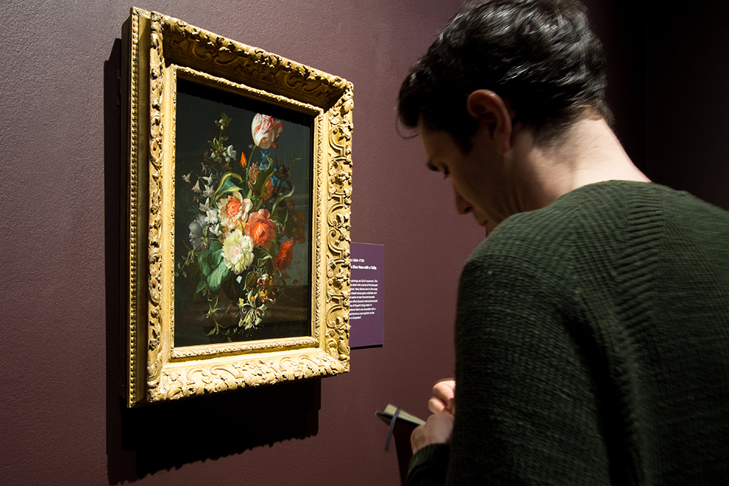 With works from the late 16th century to the end of the 18th, the exhibition features carefully chosen highlights from around 200 years of Dutch flower painting, a genre that reached its height in the Dutch Golden Age of the late 1600s. All of the works exhibit exceptional technical skill; flower paintings were at least partly used to showcase the artist’s ability to paint from life and to master difficult effects, such as the transparency of a glass vase or the soft bloom on a bunch of grapes.