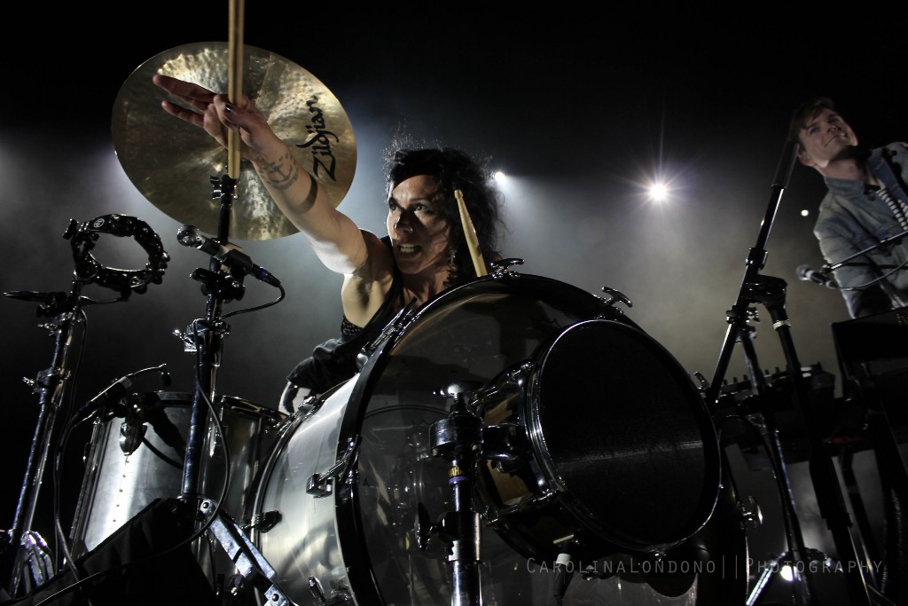 Racing through the first half of the set, it became apparent that the bass drum was just as much a plinth for an animated statue of Kim as it was a percussion instrument, worshiped by her adoring fans as she gyrated on top of it. Whilst behind the kit she smashed her cymbals like she had an ongoing feud with them, gritted teeth hiding an ear-to-ear grin.