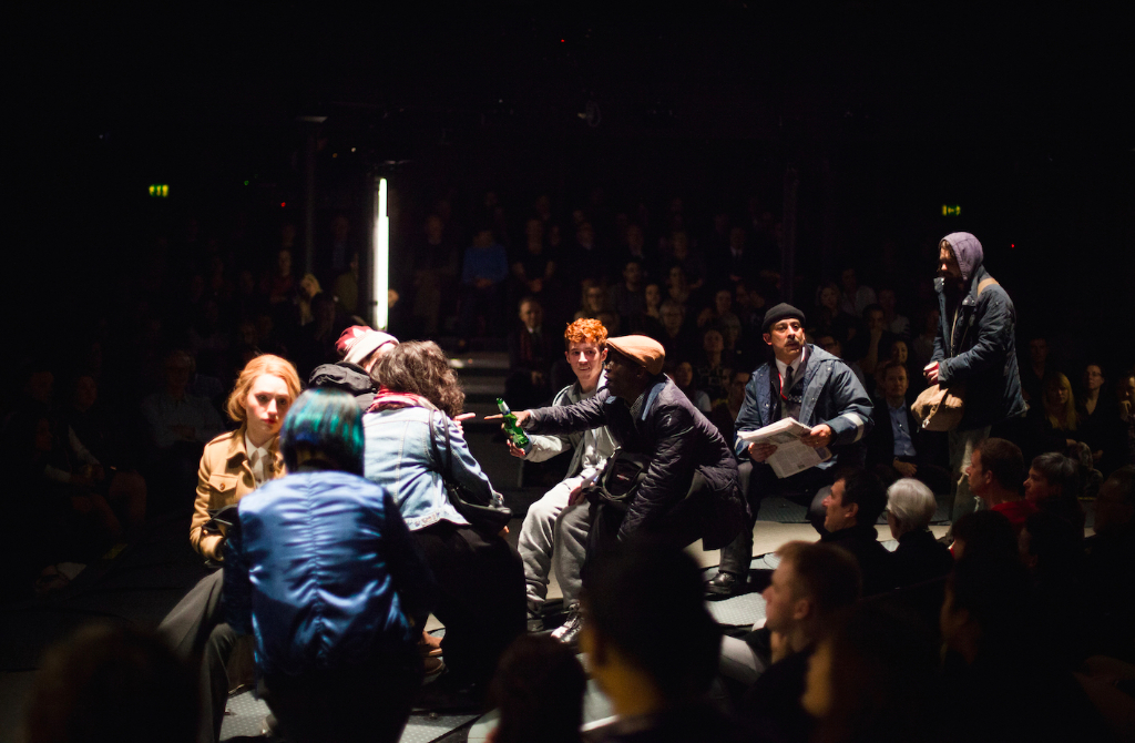 The set is as fluctuant as the way of the main protagonist: set in the middle of the theatre, the stage is made up of a moving walkway, reminiscent of a baggage conveyor belt, which moves the characters along. The rest of the set is equally unfixed, constantly destructed and reconstructed – new props are added by the minute. A seat in the stalls is thus highly recommendable as it allows the viewer to become absorbed in the chaos of Liam’s life.