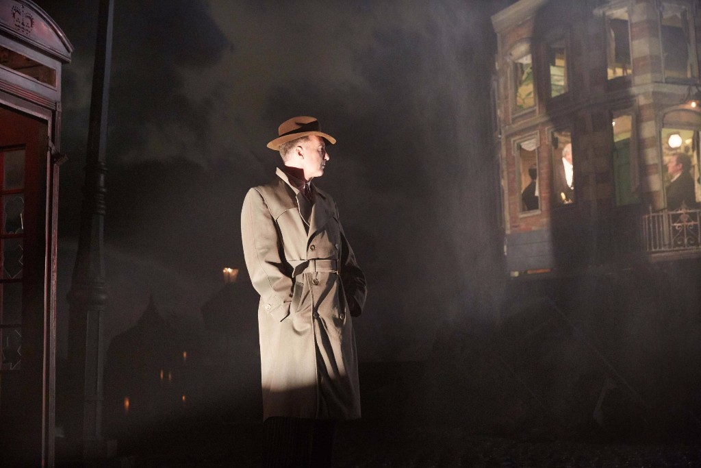 With children scampering, the curtain is raised to dramatic blasts, revealing a scene of post-war devastation, smoke and ruins, an odd-looking burned-out house perched on stilts, and from inside the laughter and chatter of an apparently oblivious bourgeois gathering. Arthur Birling is a wealthy businessman celebrating en famille his daughter Sheila’s engagement to aristocratic Gerald Croft. Speaking about world affairs, Birling states “The way some of these cranks talk now, you’d think everybody has to look after everybody else, as if we were all mixed up like bees in a hive. Community and all that nonsense.” At that moment appears a film noirish character in a trench coat and fedora, Inspector Goole, inquiring about the recent gruesome suicide of a young woman, Eva Smith.