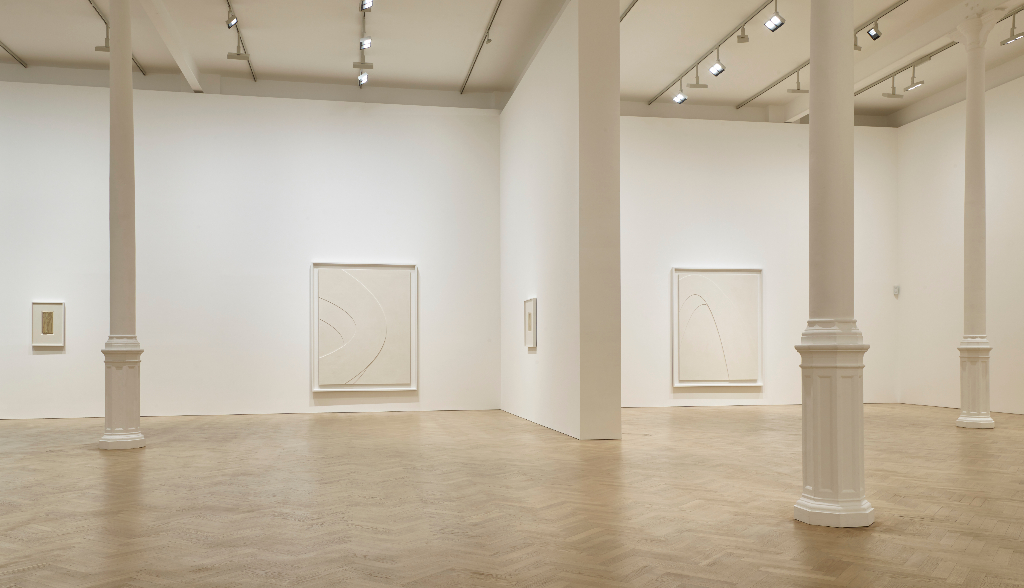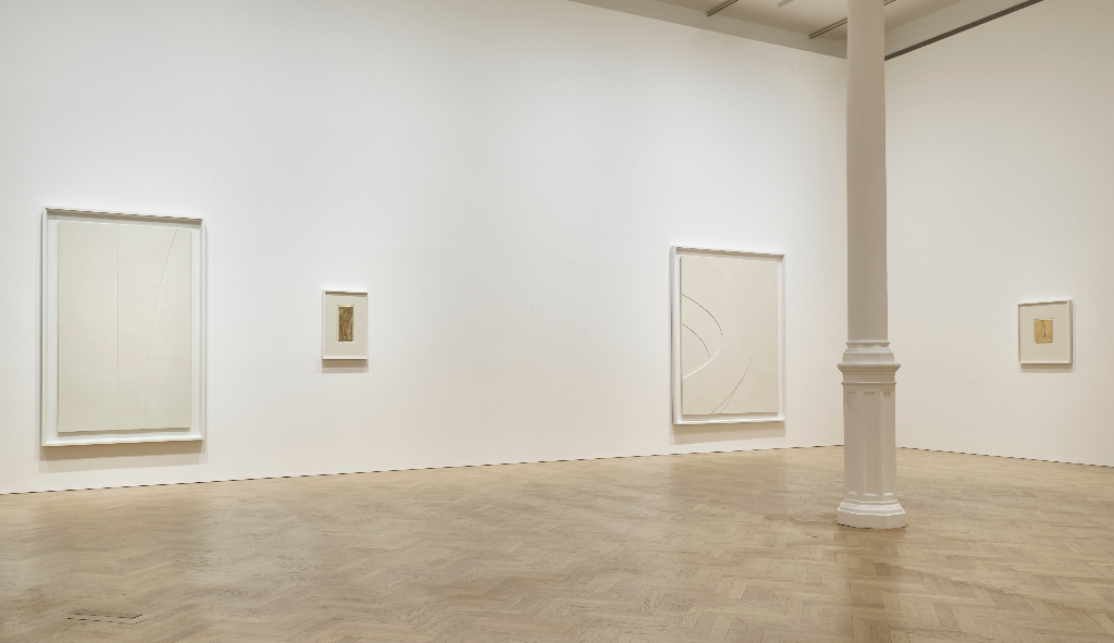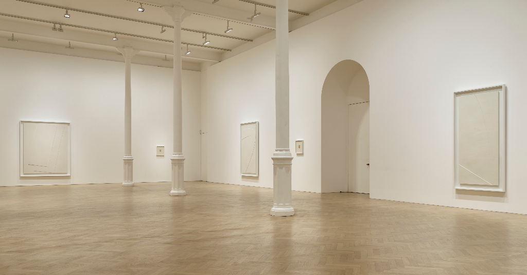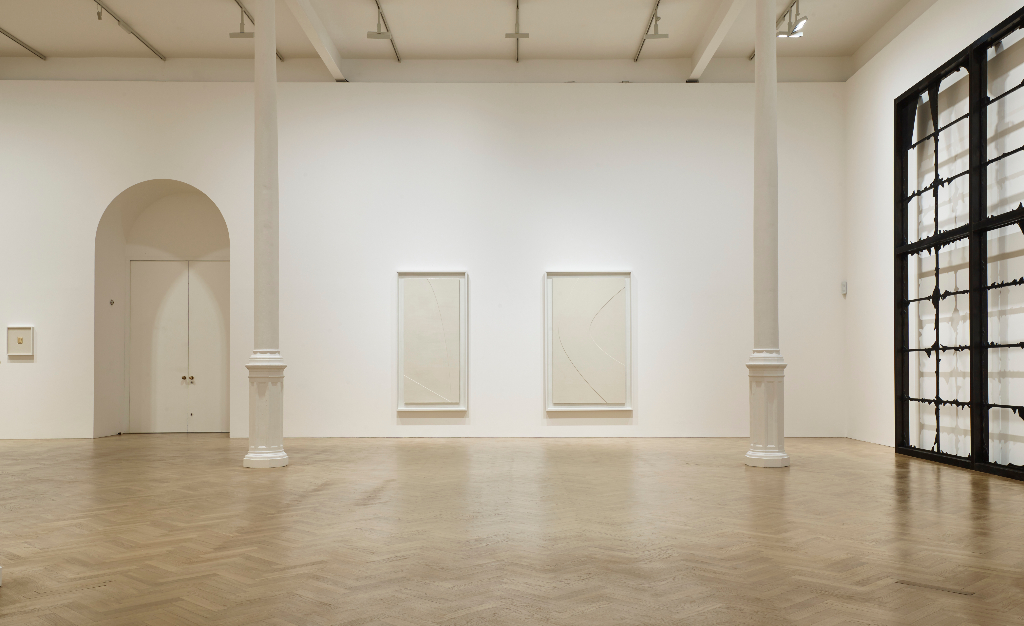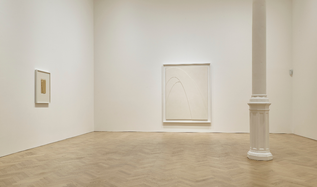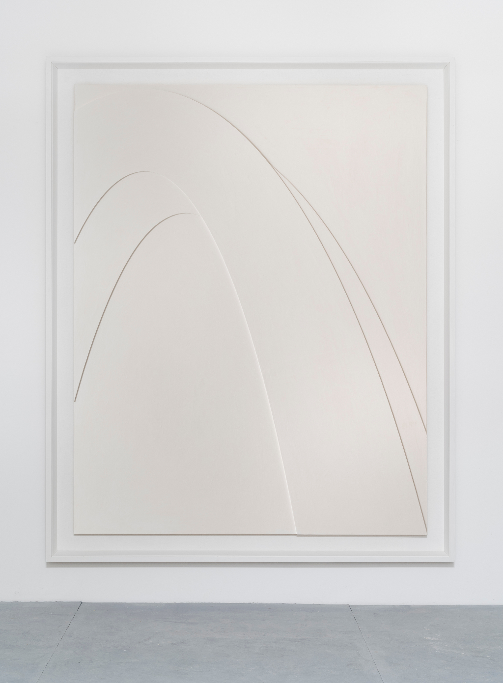 White Black Gold is the new exhibition of Keith Coventry’s most recent work at Pace London. A continuation of his Pure Junk series, which has previously consisted of constructivist cropped renditions of discarded McDonald’s packaging as symbols of rampant consumerism, his paintings are dispassionate, esoteric and mostly cream-coloured, containing monochrome rectangles, squares, and portions of McDonald’s arches, or bronze and gold geometric shapes within the bland canvases.