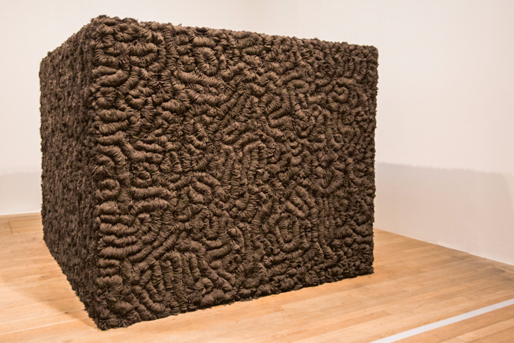 Other works focus on the human body, sometimes in a very literal sense, with pillows embroidered with hair and toenail clippings suspended in a plexiglass cube. Slightly macabre though this might seem, these surreal items nevertheless powerfully explore what it means to be a human being and to be living in a human body in the modern world.