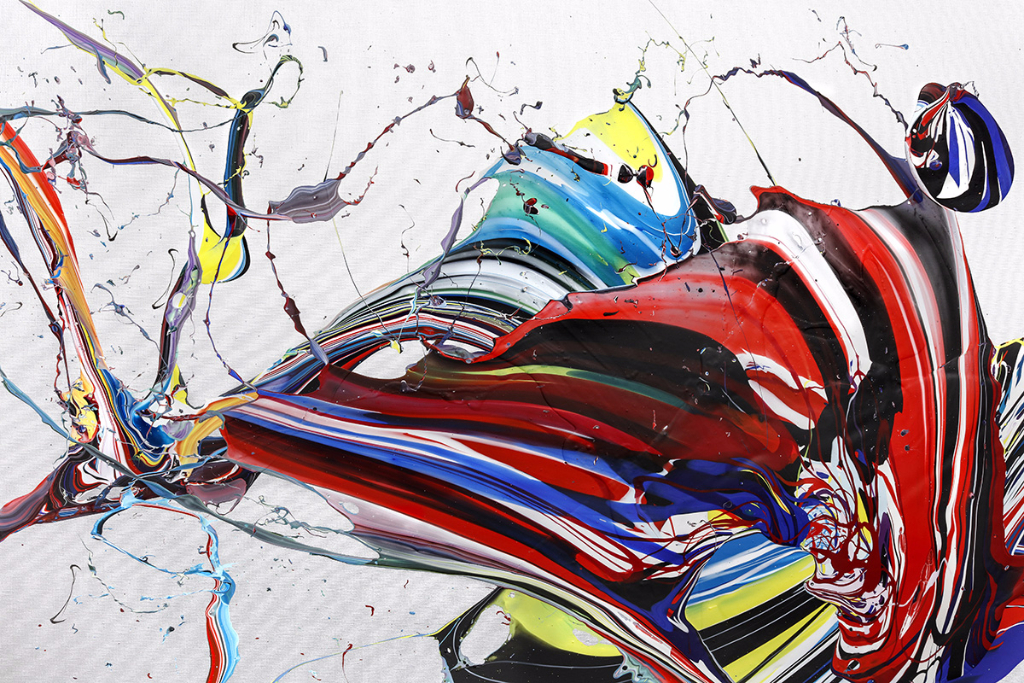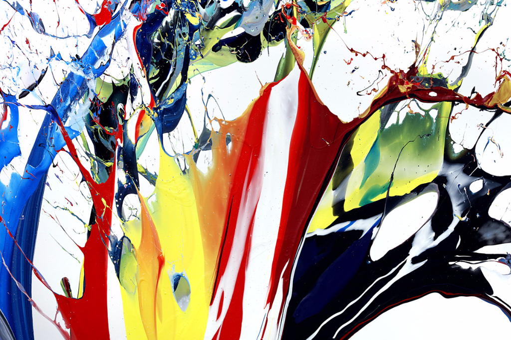 Upon walking into Lazarides Rathbone, the viewer is immediately struck by how vibrant the works on show are. On every wall are large canvases, bright white, blue and red, covered with fascinatingly perfect splashes of paint in every colour, immediately prompting the question of how they have been achieved. The smooth, tactile surface of the paint is made up of several colours, which have maintained a clear distinction despite being mixed together like strands in an unravelling tapestry.