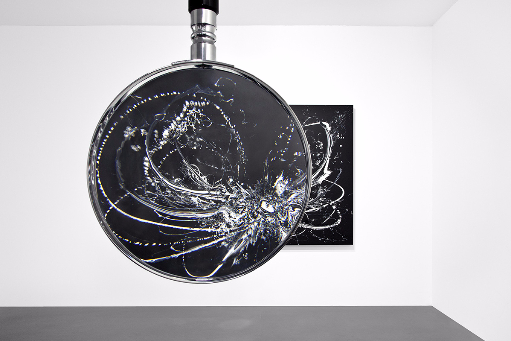 In the second room, two canvases are painted in tones of black, white and grey. If anything, these works feel even more intricate than their colourful counterparts. One of them is part of an installation, Perception of the Stendhal Syndrome – a huge magnifying glass hangs in the centre of the room and the viewer is encouraged to look at the painting through it, exploring it both at a distance and in depth.