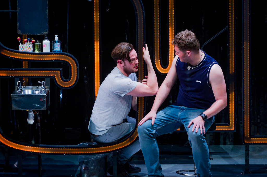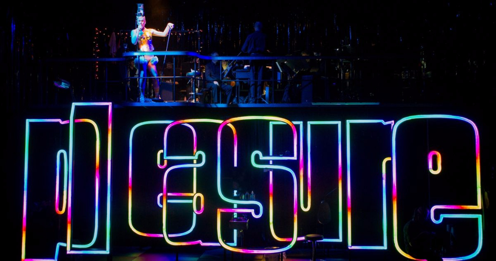 The cutting-edge set is well conceived, with enormous letters adorned in pink lights (which constantly change colour) forming the word “pleasure” as a kind of ironic, maze-like structure. The classic nature of the operatics starkly contrasts with the toilet as a set, as if a reflection of the characters’ unhappy lives, but with hope of something more noble.