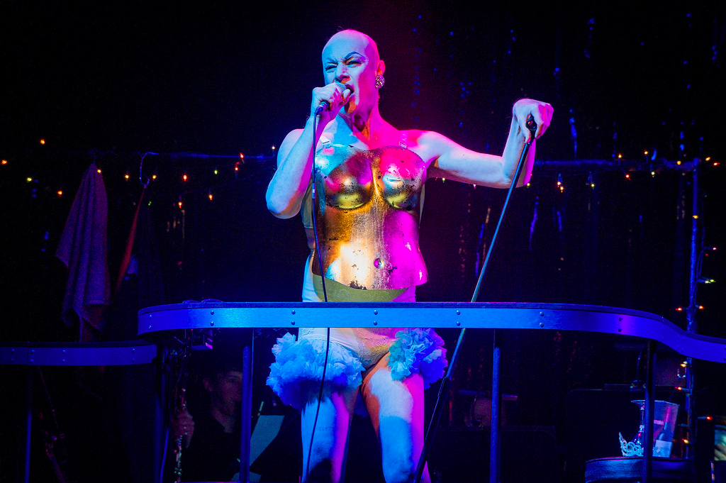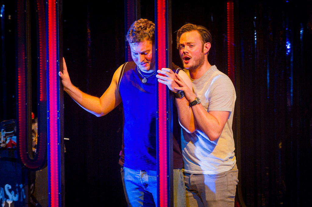 Directed by Tim Albery, composed by Mark Simpson and written by Melanie Challenger, Pleasure is an ironic title for an opera about human misery set in the toilet of a gay bar. Escaping from the harsh realities of a homophobic world through meaningless sexual encounters, but yearning for love, the young patrons still have sparks of hope, while a cynical ageing drag queen, Anna Fewmore (Steven Page), discourages them: “So I made an art of decay. I taught the young men the art of seeking pleasure”.
