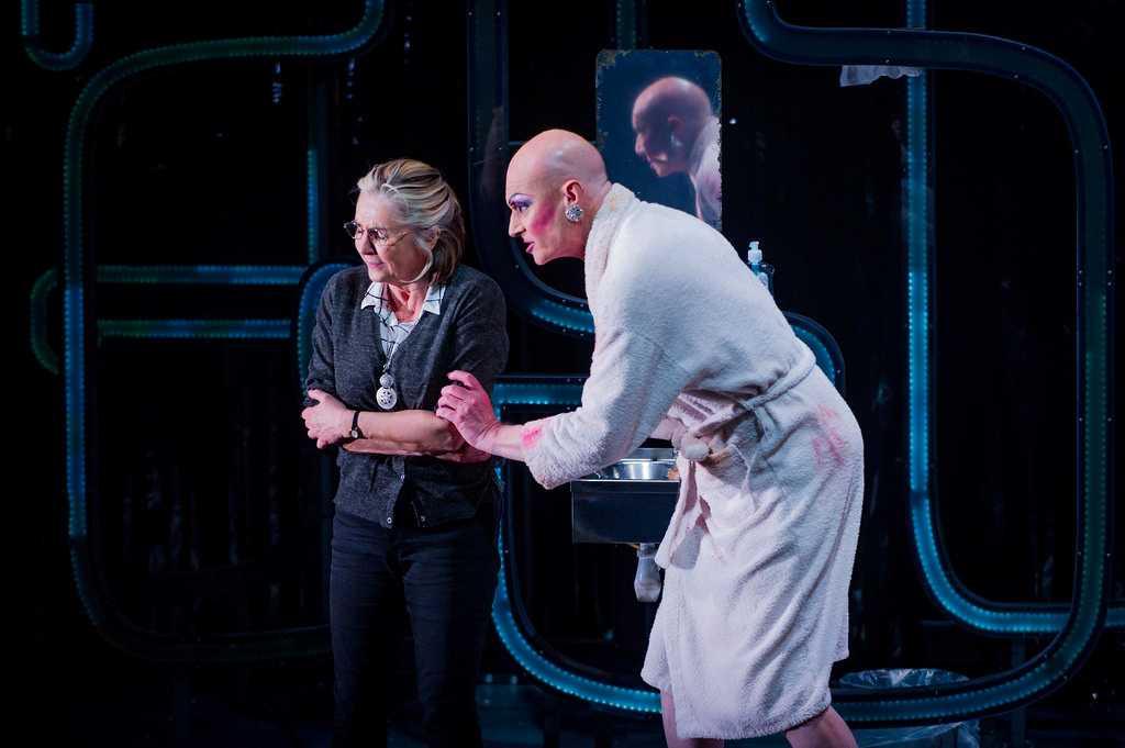 The men confide in a woman, Val (Lesley Garrett), who works in the loo of the gay bar, and won’t leave because she enjoys mothering the young customers, who tell her tales of woe and joy about their various conquests. One day a young straight man walks in, whom she discovers is her son, lost long ago. He is seduced by one of the patrons, who approaches him with an adoration that soothes his damaged soul: “I’ve never been looked at like that… Do you think it’s possible to separate yourself and become something different?”