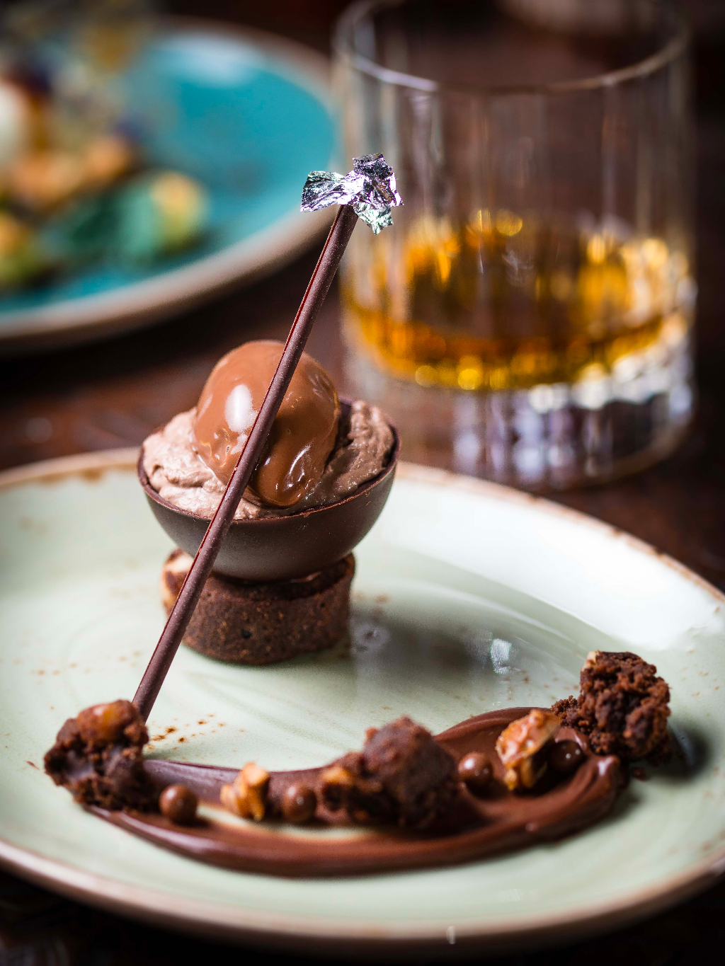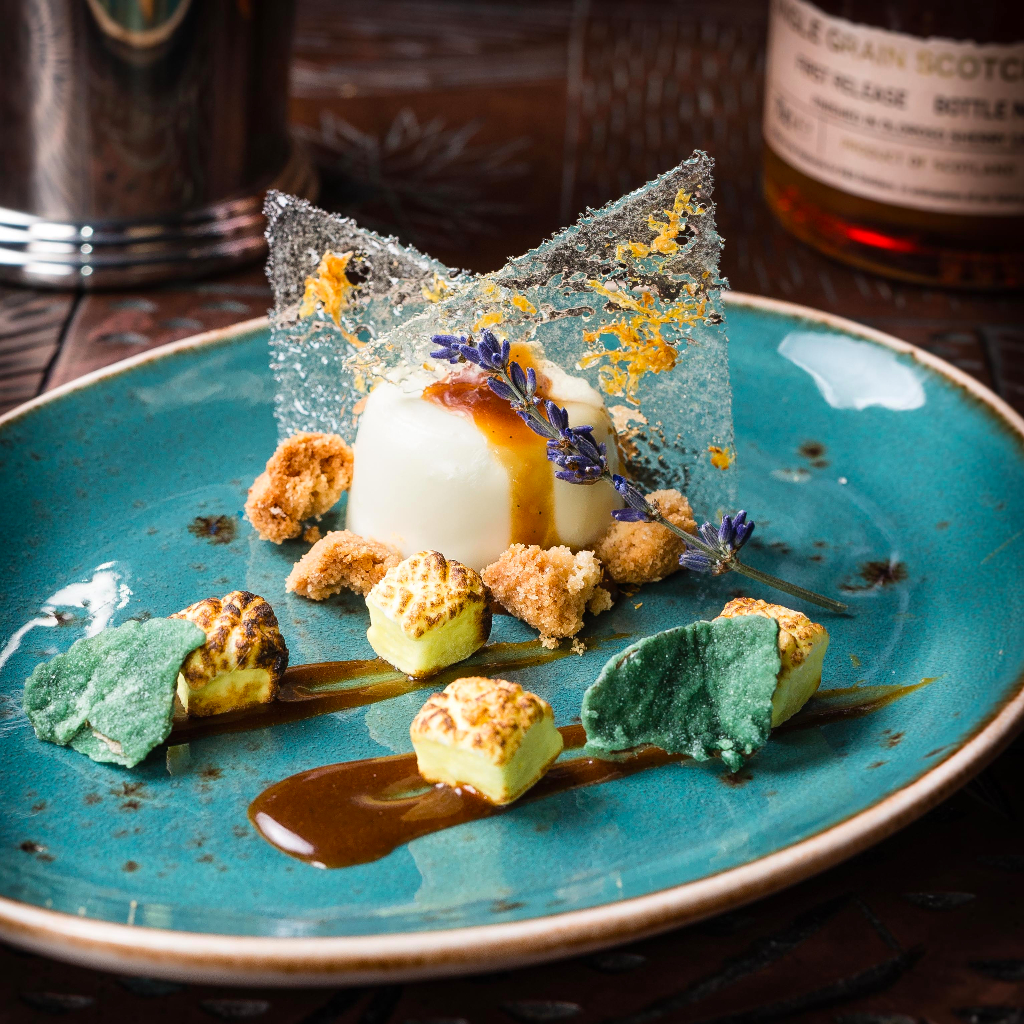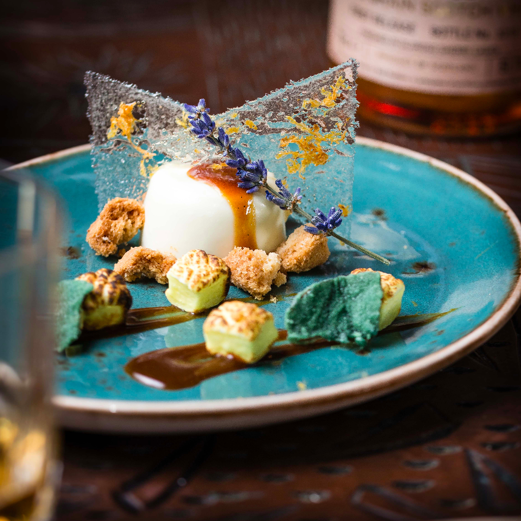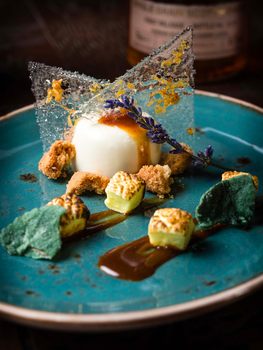 Sometime after this, our second dram and accompanying sweet treat arrived in the form of a Raasay single malt served alongside a fantastically flavoursome Mint and Yuzu Panna Cotta with Lavender Toffee and Yuzu Marshmallow. This was another strong pairing, with the whisky’s warm, earthy flavours excellently contrasting the refreshing citrus and mint hit of the panna cotta. Also of note here was the lavender toffee that, although surprising, worked brilliantly as an accent to the rest of the dessert.