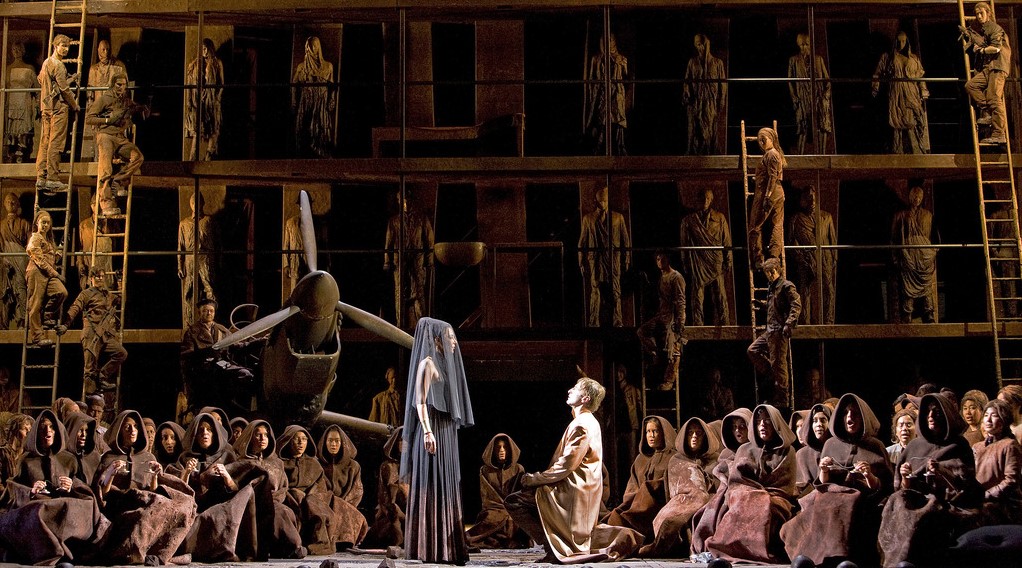 Interestingly, the set and costumes are very postmodern. Clothing is mostly brownish and appears to be of 1940s fashion, although at times also ancient Greek. The set is superb and elaborate with extraordinary multi-tiered structures and exceptional lighting design. The “Sphinx” appears as an odd sort of aeroplane.
