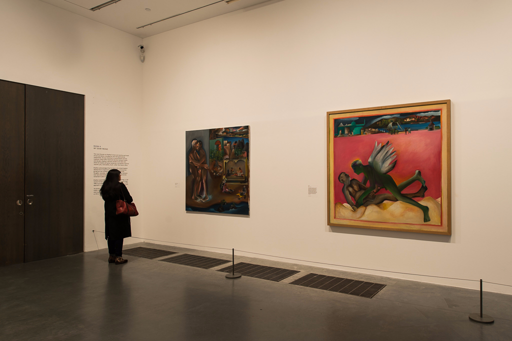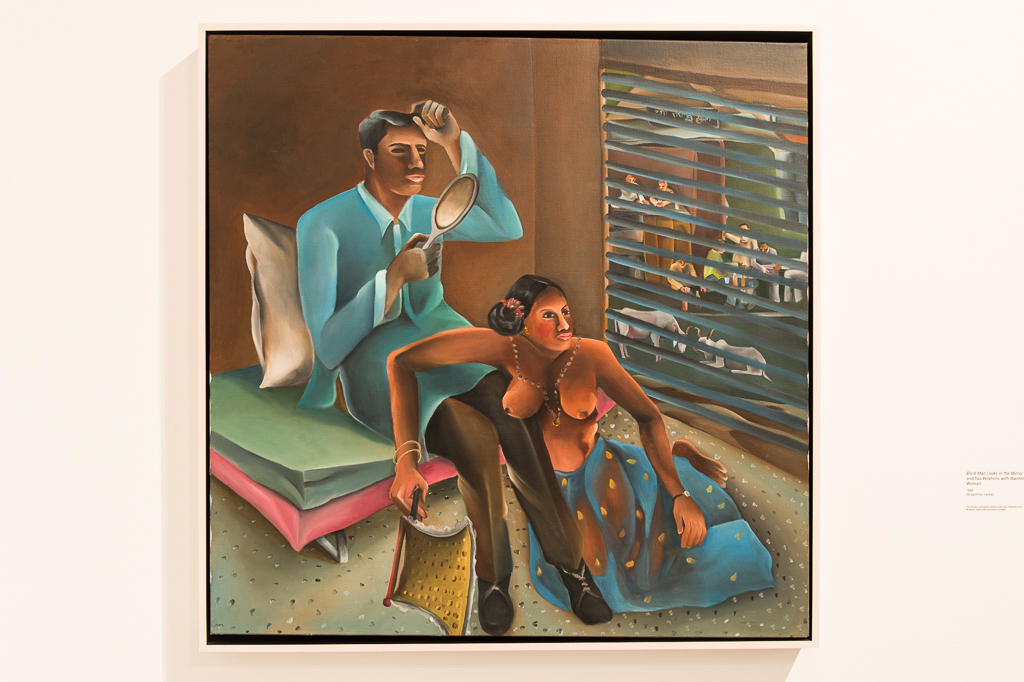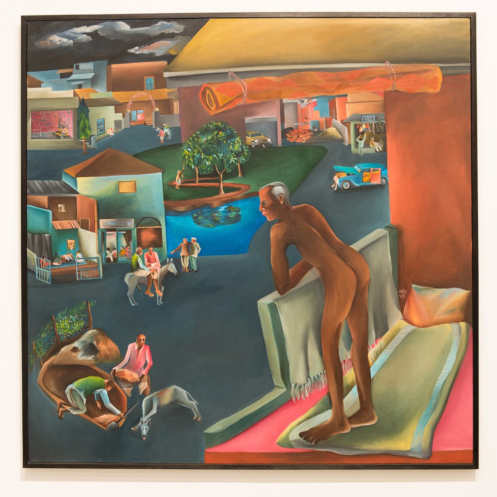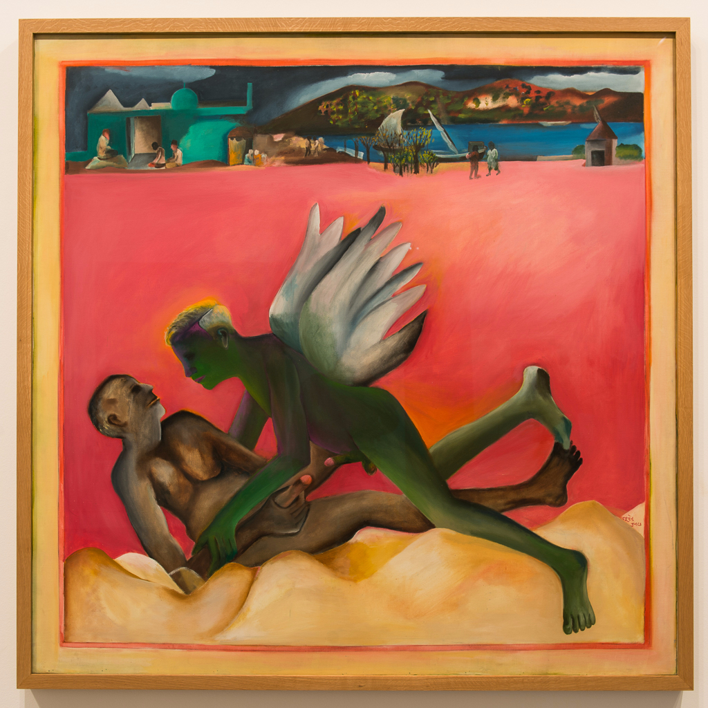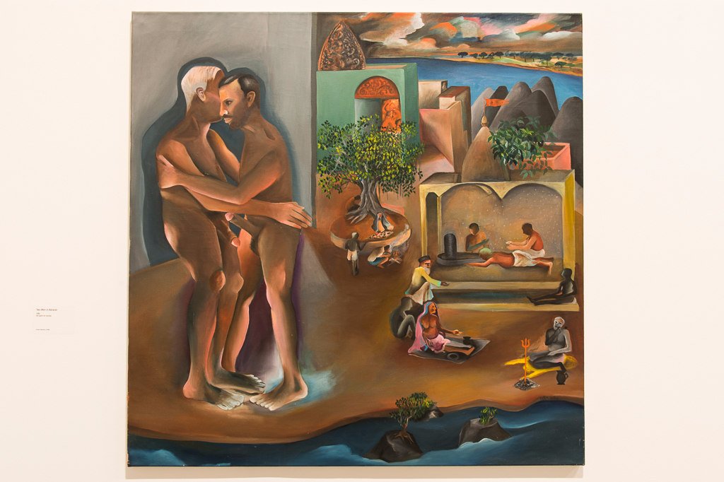One room looks specifically at Khakhar’s representations of homosexuality, a theme which runs as an undercurrent through all his work. Men are locked in tender but highly erotic embraces, often placed in the foreground, which acts as a sort of visual limbo between the viewer and the life portrayed in the background of the painting. To paint explicit homoerotic scenes in India in the 1980s was highly controversial, and several of the works are imbued with a telling nervous energy.