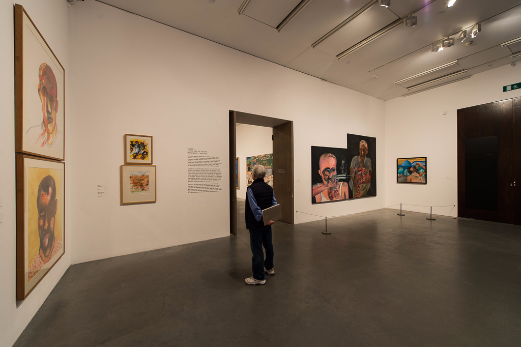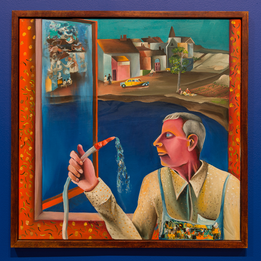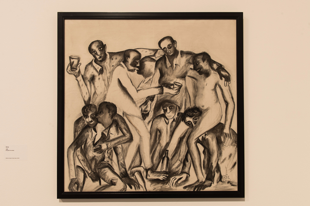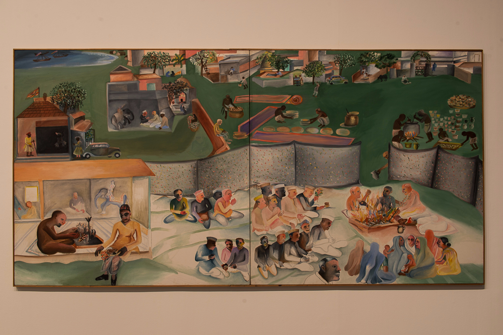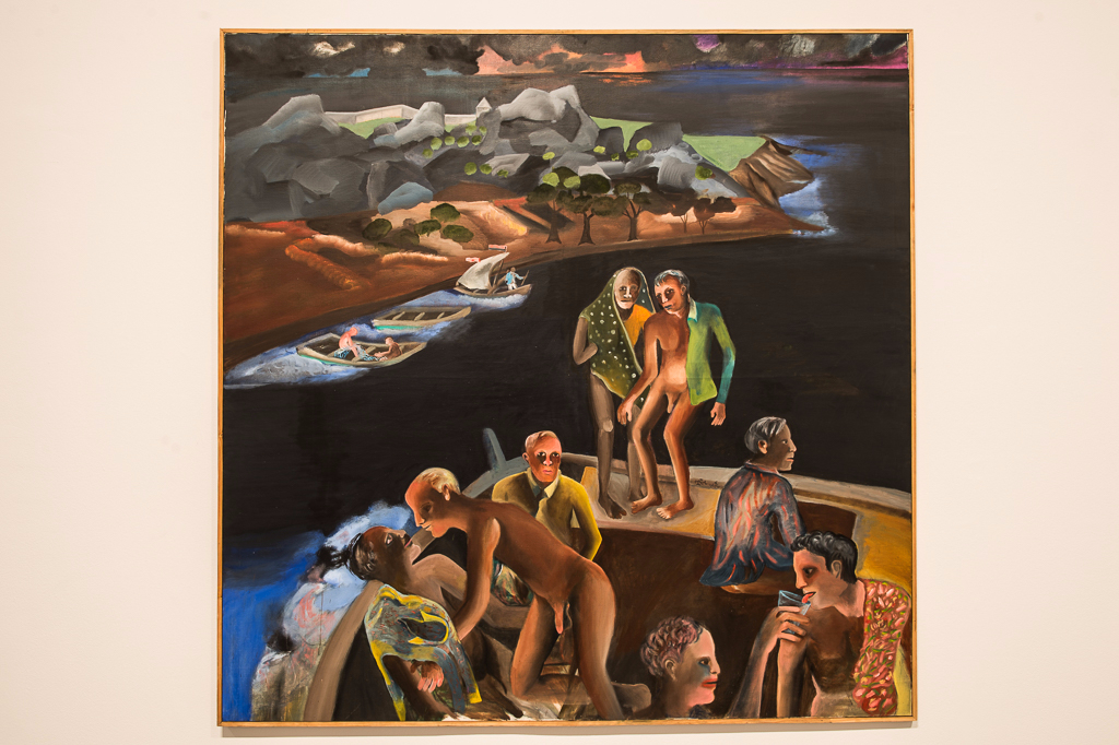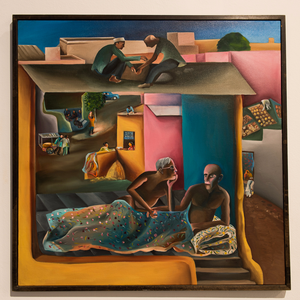 One room looks specifically at Khakhar’s representations of homosexuality, a theme which runs as an undercurrent through all his work. Men are locked in tender but highly erotic embraces, often placed in the foreground, which acts as a sort of visual limbo between the viewer and the life portrayed in the background of the painting. To paint explicit homoerotic scenes in India in the 1980s was highly controversial, and several of the works are imbued with a telling nervous energy.