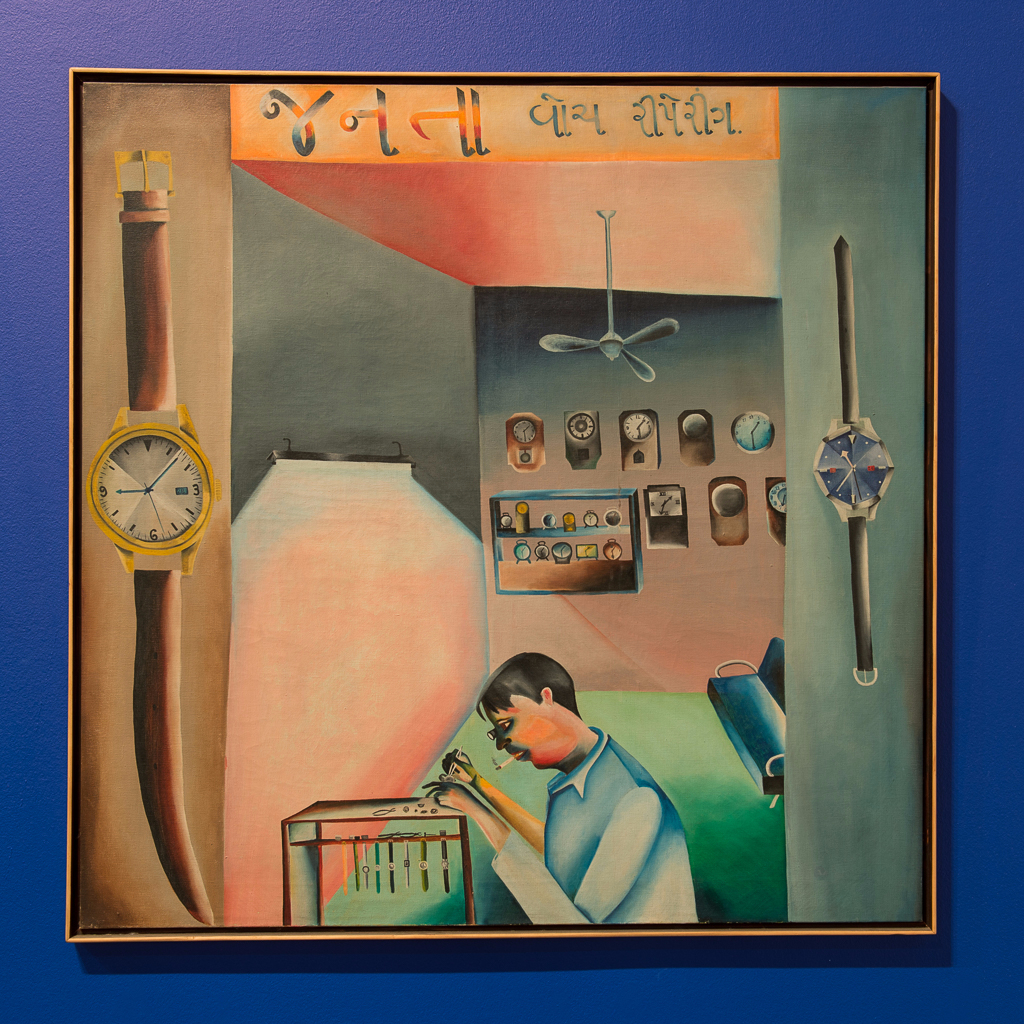 Khakar’s work typically mixes tropes from East and West and from high and low art, creating a unique hybrid style of painting. For example, in the foliage depicted in Man Leaving (Going Abroad) (1970) there is clear evidence of Henri Rousseau’s influence, while paintings such as You Can’t Please All (1981) recall the narrative storytelling found in Sienese Renaissance paintings. This Western influence is combined with distinctly Indian imagery, taken from mythology, religion and everyday life.