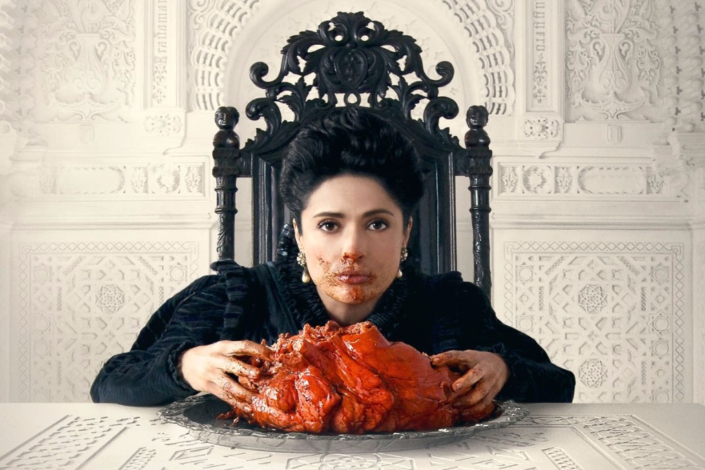 The same keen eye for a stunning image that’s liable to send you reaching for the holiday brochures is also likely to leave many of the key scenes seared into your mind, like memorised illustrations from a favourite childhood storybook. To speak too much of their macabre majesty is to ruin the joy of discovery, but the stark poster image of Hayek, regally clad in black against an ornate white background and greedily munching upon a basketball-sized scarlet heart is an especially vivid example.