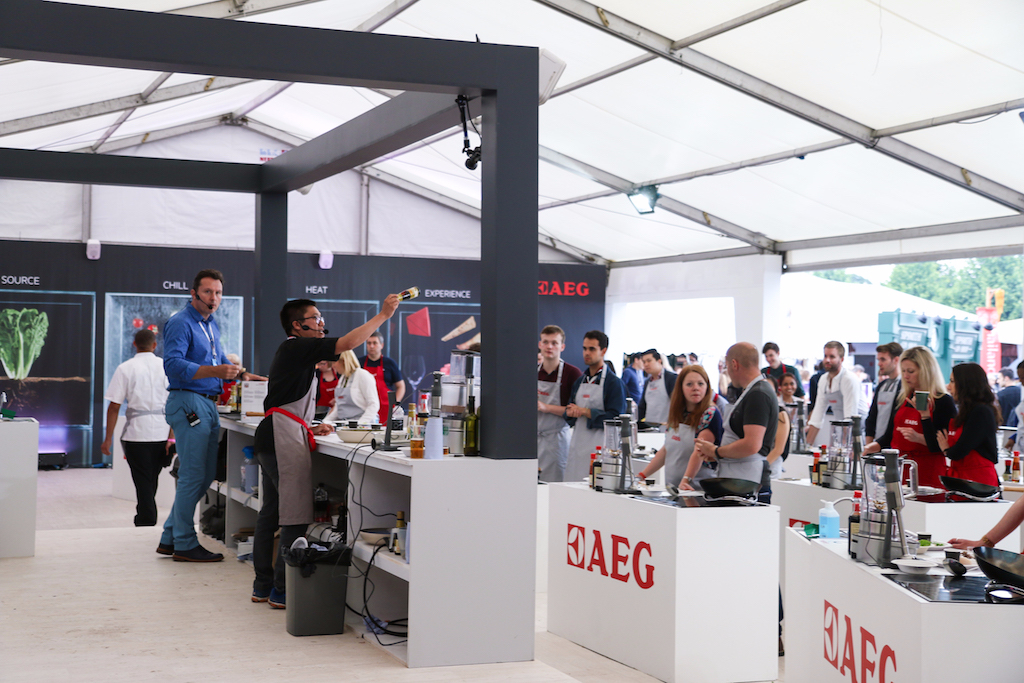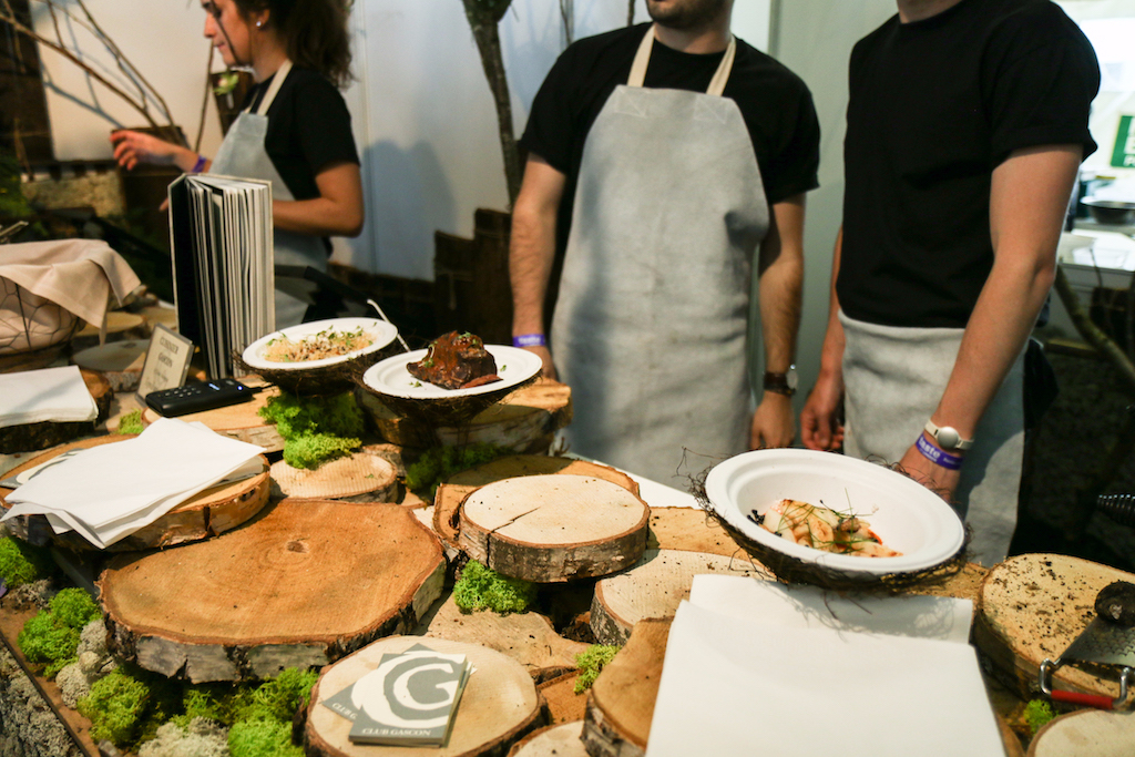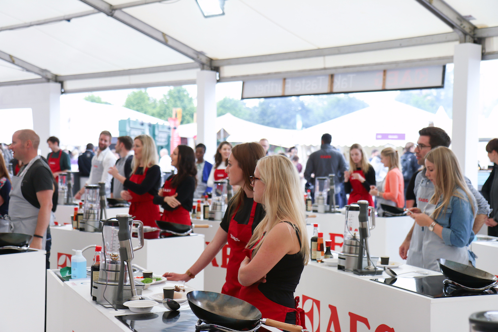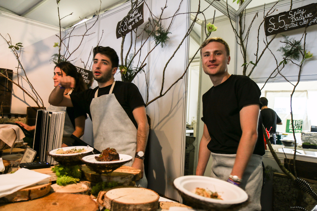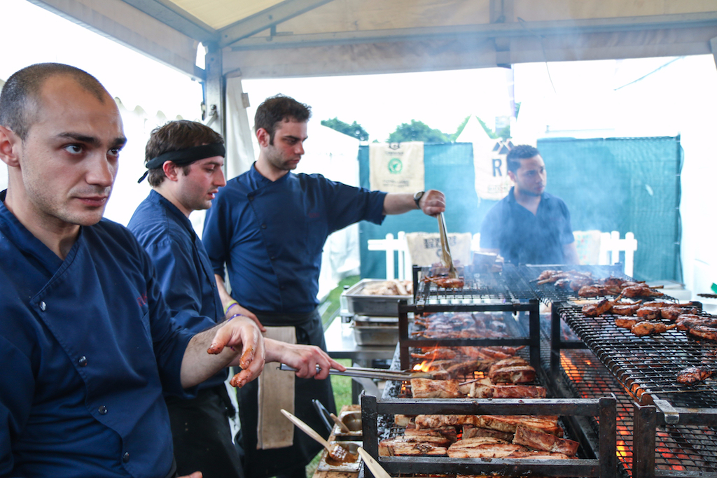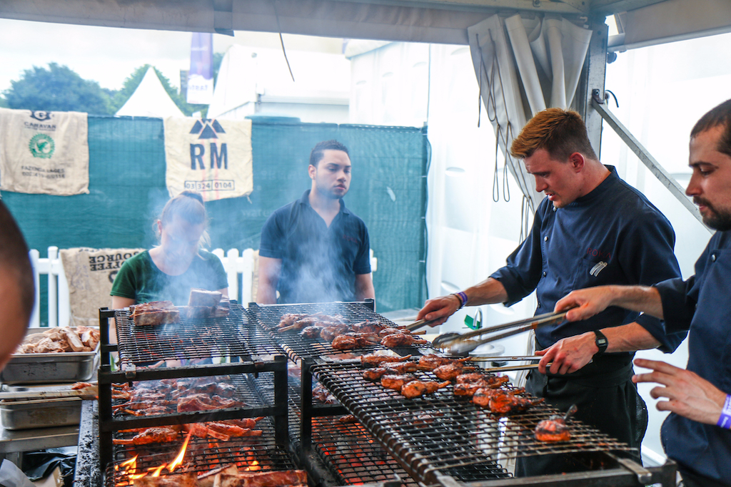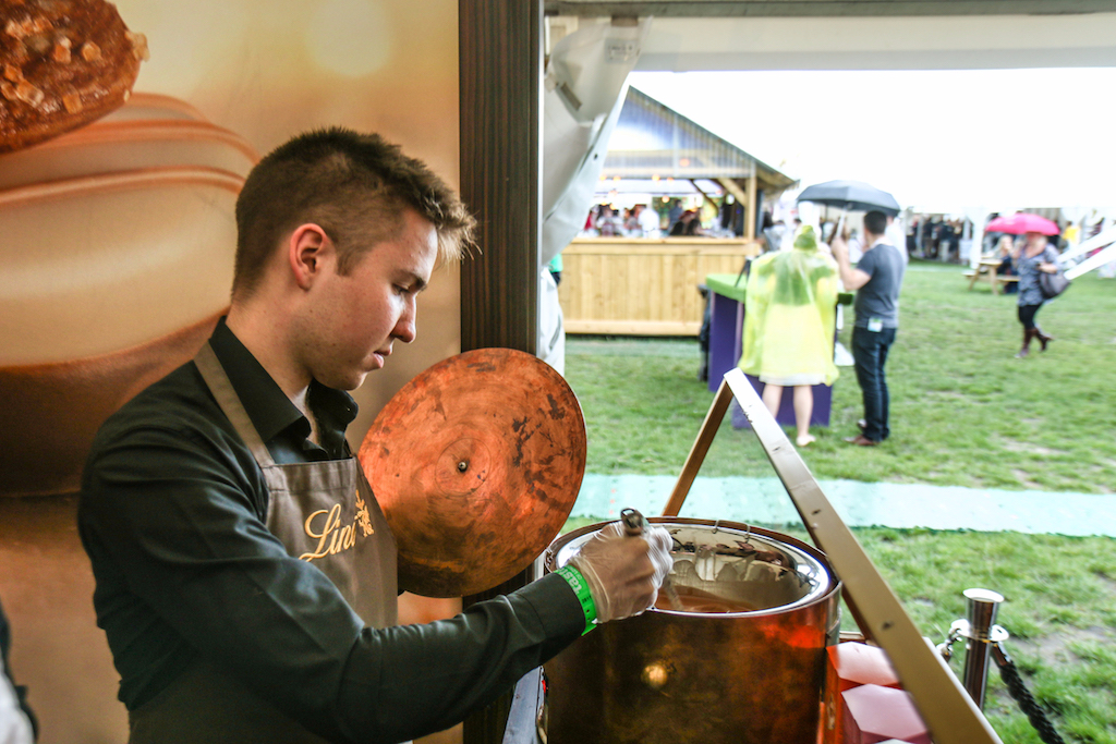 Beyond the range of outstanding restaurants on offer, there’s a fine selection of stalls selling everything from artisanal popcorn to handcrafted chocolates. The first thing that catches our eye is the gleam of copperware at Chaleureuse, whose tables groan under a stunning selection of timeless pans. Next up, the wax-sealed wheels of Black Bomber from the Snowdonia Cheese company are well worth a try for any fans of seriously mature cheddar; wash it down with raspberry-infused Pinkster gin, which will no doubt enjoy another summer as a key ingredient in many a lazy cocktail.