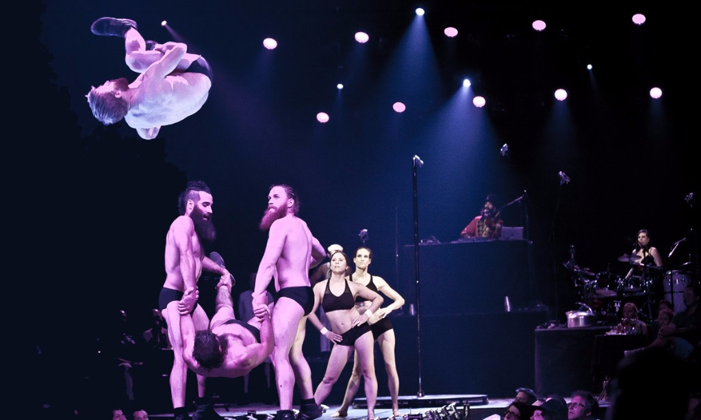 Bizarre background video clips add to the building mayhem as the acts become more and more out of hand and the performers take a hold over their audience, making them cringe one minute at their skilled clumsiness onstage and roar with laughter the next at their ridiculous straight-faced dancing. A mentalist and a two-headed man harp back to early circus performances and freak shows, whilst hipster beards and casual nudity place us firmly in the present day, all interlaced with a strong Franco-Canadian influence and references to Quebecois tradition. And it might not seem the most obvious form of entertainment, but who knew just how thrilling watching a man wearing nothing but a disco ball precariously spinning in a giant hula-hoop and manically shooting light left, right and centre could really be?