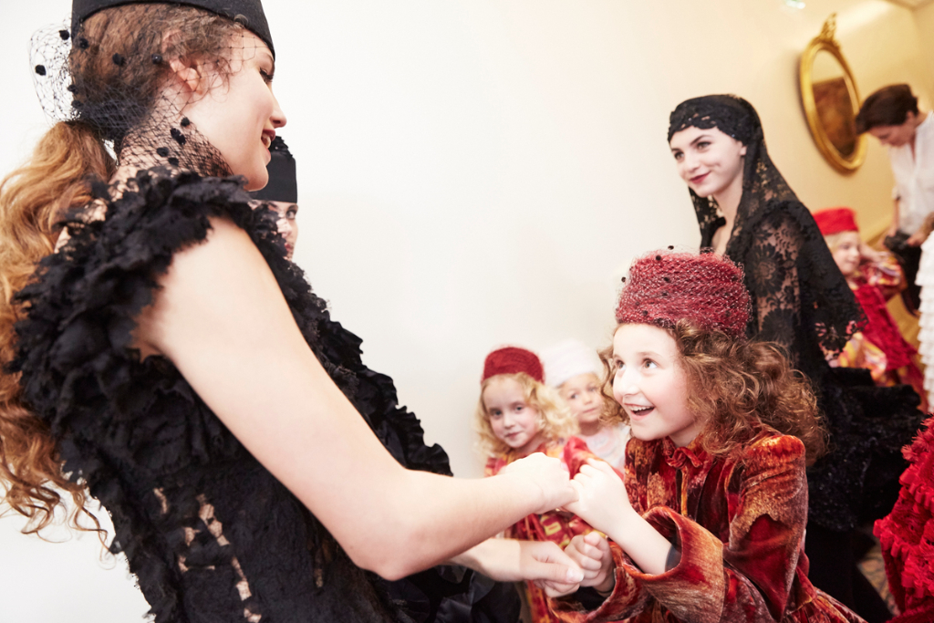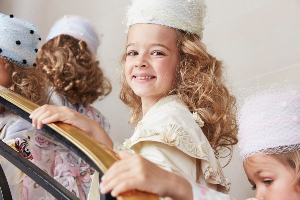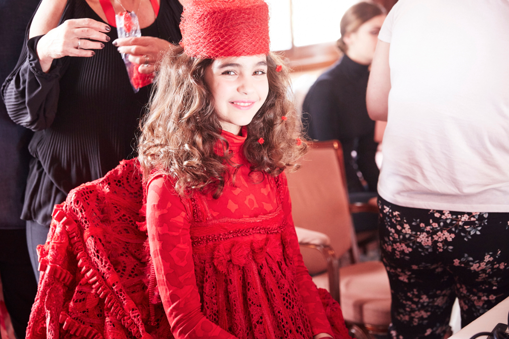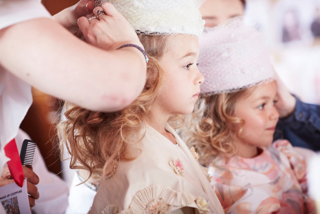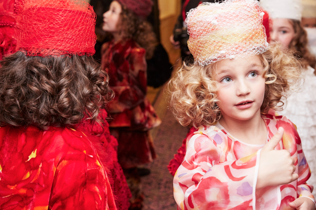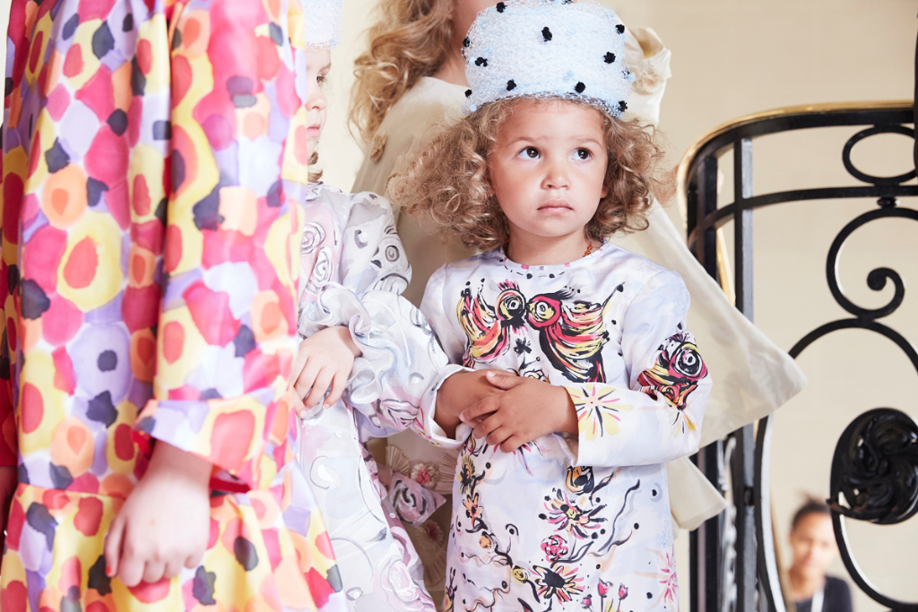 Sorbier’s departure from his norm comes with his mini-collection of childrenswear, presented by a troupe of smiling, excitable young models dressed in block bright shades and colourful folkish patterns. This ready-to-wear collection echoed the silhouette of the womenswear pieces: similar hats, in playful colours, were propped on little heads and scaled-down versions of ribbon-adorned, taffeta coats were worn with pumps and handheld lollipops.