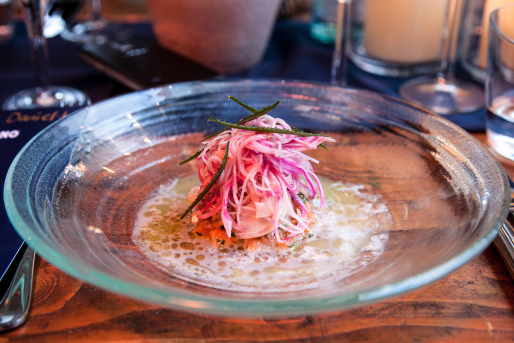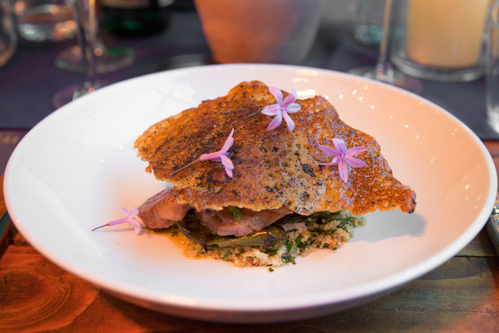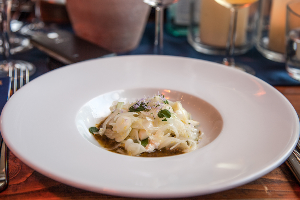 This week, the event opens with the ever-acclaimed Ollie Dabbous, and with Buffalo Milk Ricotta with Cipollini Onions, Crushed Sicilian Pistachios, Amalfi Lemon and Nepitella. Serving the onion finely sliced and raw raises some eyebrows at first, but it forms a great sweet-and-sour contrast with the pistachio praline that lurks in the middle of a silky mound of ricotta. The kick of lemon is there but it’s appropriately faint, a pleasingly subdued note in the greater symphony of flavour, rather than the dominating force it so often becomes. Its vivid, playful flavours are complimented by an Etna Bianco Graci 2014, whose crisp acidity works well against the praline.