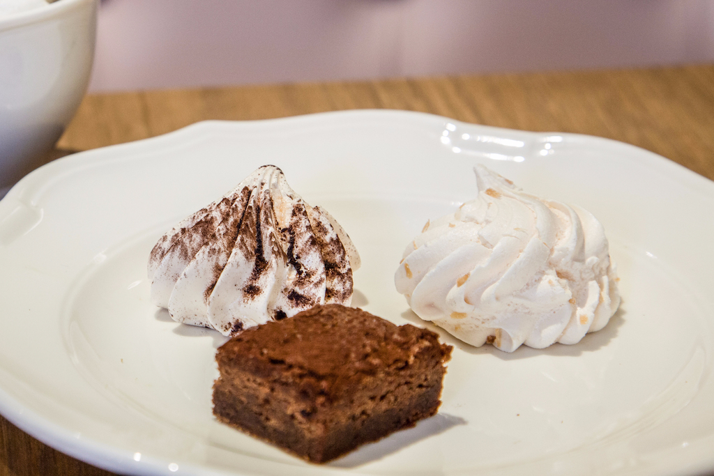 So it’s with eager anticipation that we tuck into the sweeter treats. A Valrhona brownie is gorgeously indulgent, the sheer quality of the chocolate used shining through with aplomb. The cafe’s crisp meringues are given only the subtlest of flavourings, ensuring their own delicate flavour isn’t overpowered by the coconut or chocolate toppings. A red velvet cupcake is certainly the highlight; it’s a moist crumb heaving under the weight of a serious blob of mascarpone cream. Too often this would be over-sweetened and monstrously rich, but here, there’s been a cautious hand with the icing sugar and it pays off, with neither cream nor cake falling into the saccharine trap.
