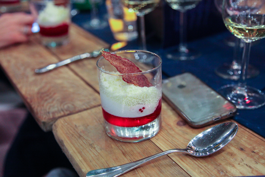 Slow Cooked Whole Cod, Creamy Rustic Polenta, Broad Beans, Black Olives and Amaretto with Pecorino has been baked in salt and brought out for the guests before being cracked open in the kitchen. It shows in the perfectly cooked flakes of fish that top a rich puck of polenta. A liberal hand with the Pecorino lent the grain a thoroughly indulgent touch, though the same cannot be said about the black olive and amaretto shards, which are applied far too lightly and barely discernible amongst the rest of the dish. A Terre Nere Etna Rosso 2014 is one of those sharp, full-bodied reds that acts as the perfect foil for creamy sauces and rich meats. Here, it cuts through the polenta’s indulgence with remarkable clarity.