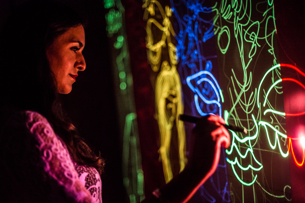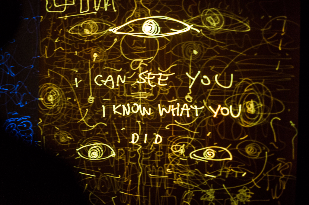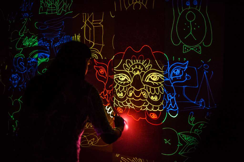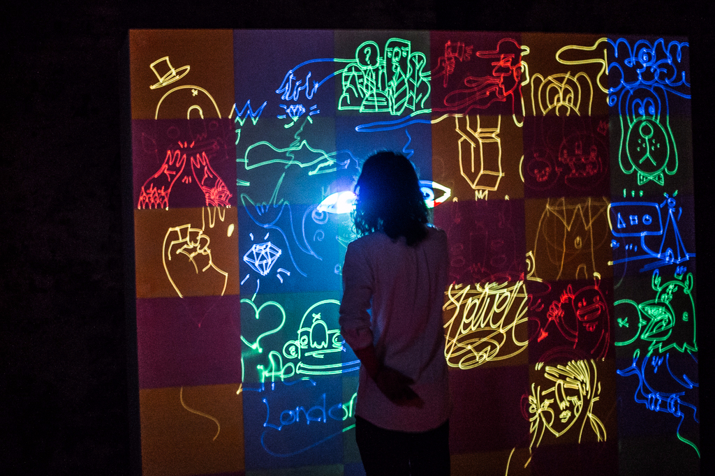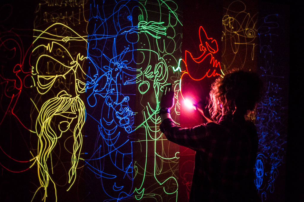 The current exhibition Light at the End of the Tunnel occupies a comparatively small space and stretches over one of the archways. The tunnel is kept entirely in the dark and, upon first glance, leaves the visitor to wonder what awaits them at the end of it. The only source of light comes from the installation itself, which truly represents the future of graffiti. Instead of paint, artists and visitors alike are invited to cover the antique walls with laser pens, leaving their glowing marks on the surface. The wall art is thus constantly changing, new sketches cover old ones and soon the walls are entirely changed.