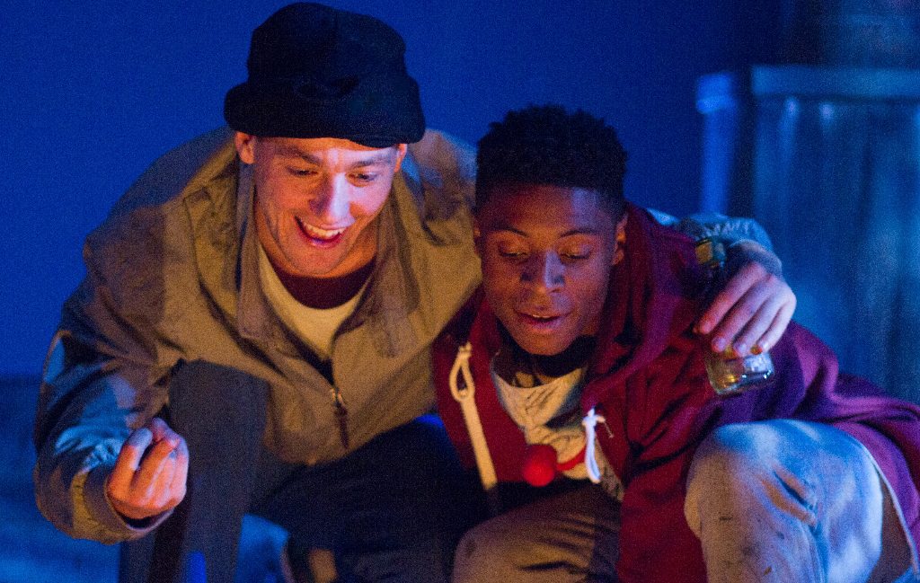 Tough Irish lad Mikey (Alan Mahon) and well-spoken Londoner Casey (Ammar Duffus) are both not as they first appear, and as the piece progresses more and more of their history, both shared and individual, is revealed. Mahon’s comic timing is flawless, but his ability to simultaneously reveal a tortured soul elevates Mikey’s character. Similarly, Duffus performs Casey’s outsider well but imbues him with all of the emotions of a 19-year-old boy in love.