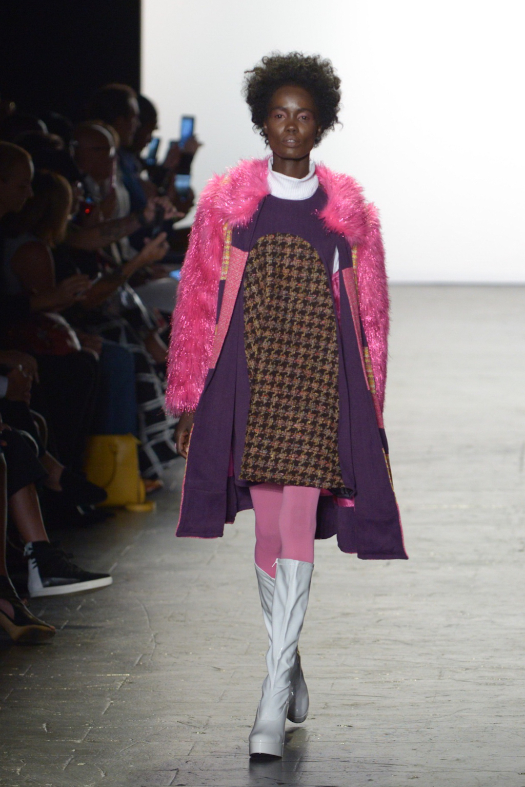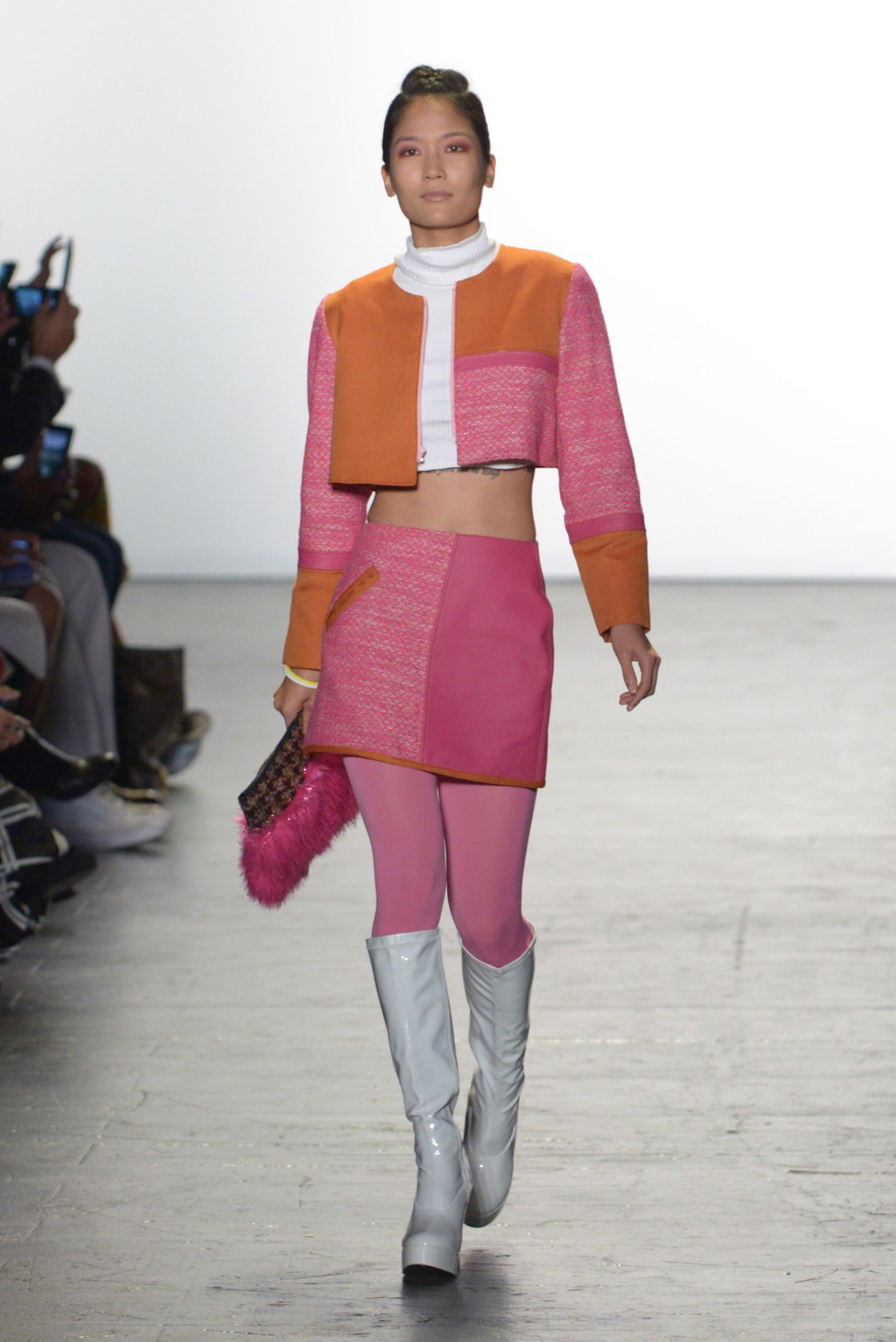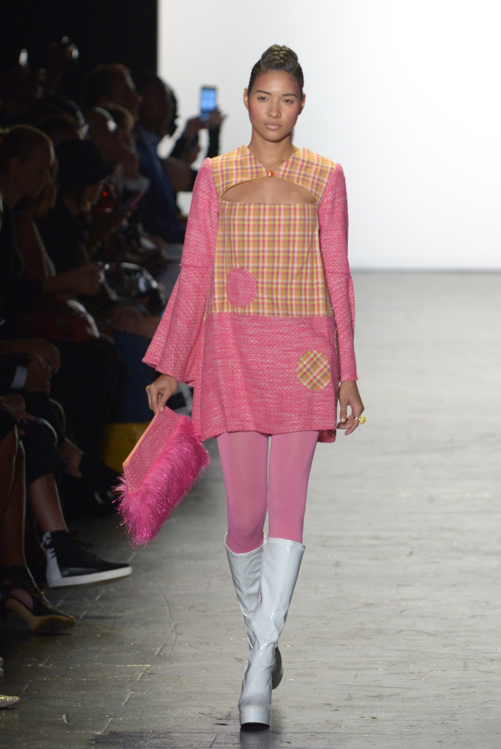 Bianca Zidik presented a cheerful collection of mod-inspired pieces. Miniskirts and short shift dresses looked fresh in bold pink patchworked fabrics kept grounded by a judicious use of tweed. The addition of pink glitter faux fur added whimsy.
