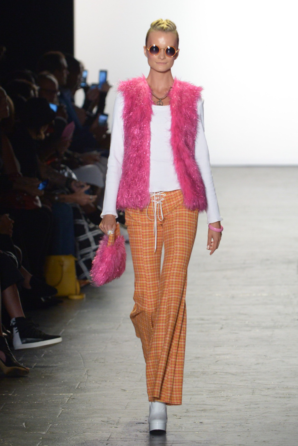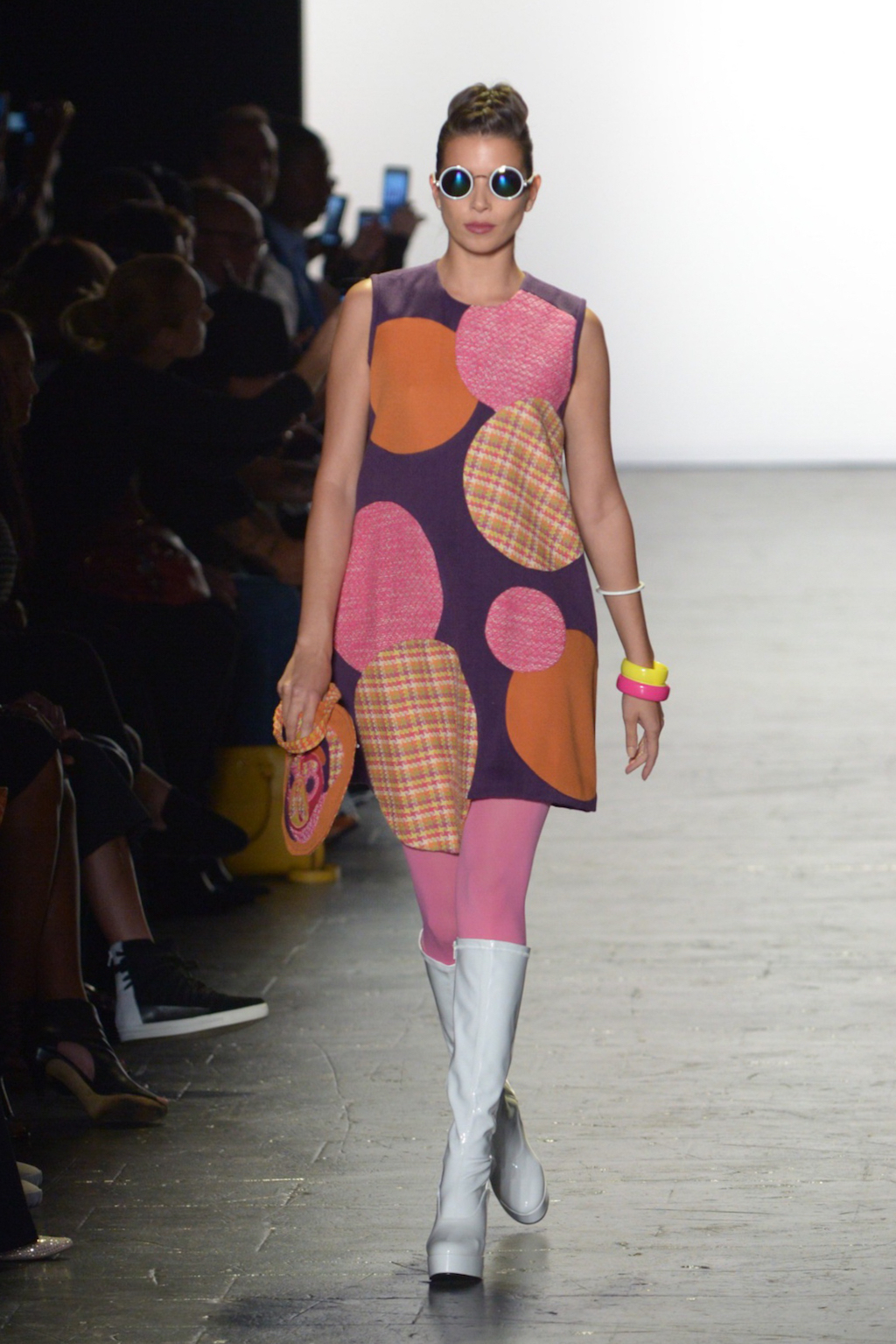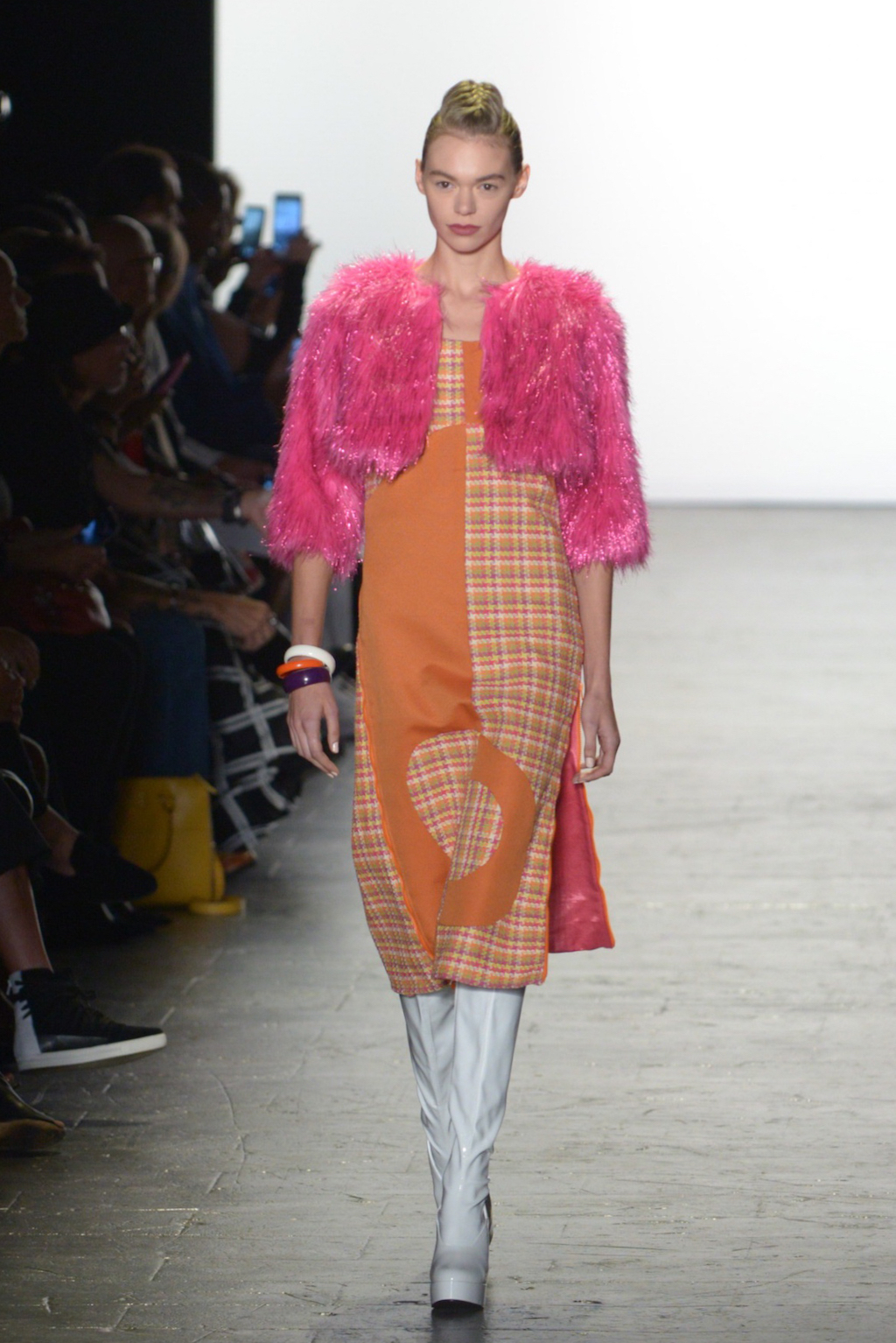 Bianca Zidik presented a cheerful collection of mod-inspired pieces. Miniskirts and short shift dresses looked fresh in bold pink patchworked fabrics kept grounded by a judicious use of tweed. The addition of pink glitter faux fur added whimsy.