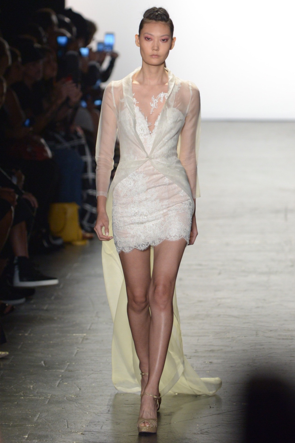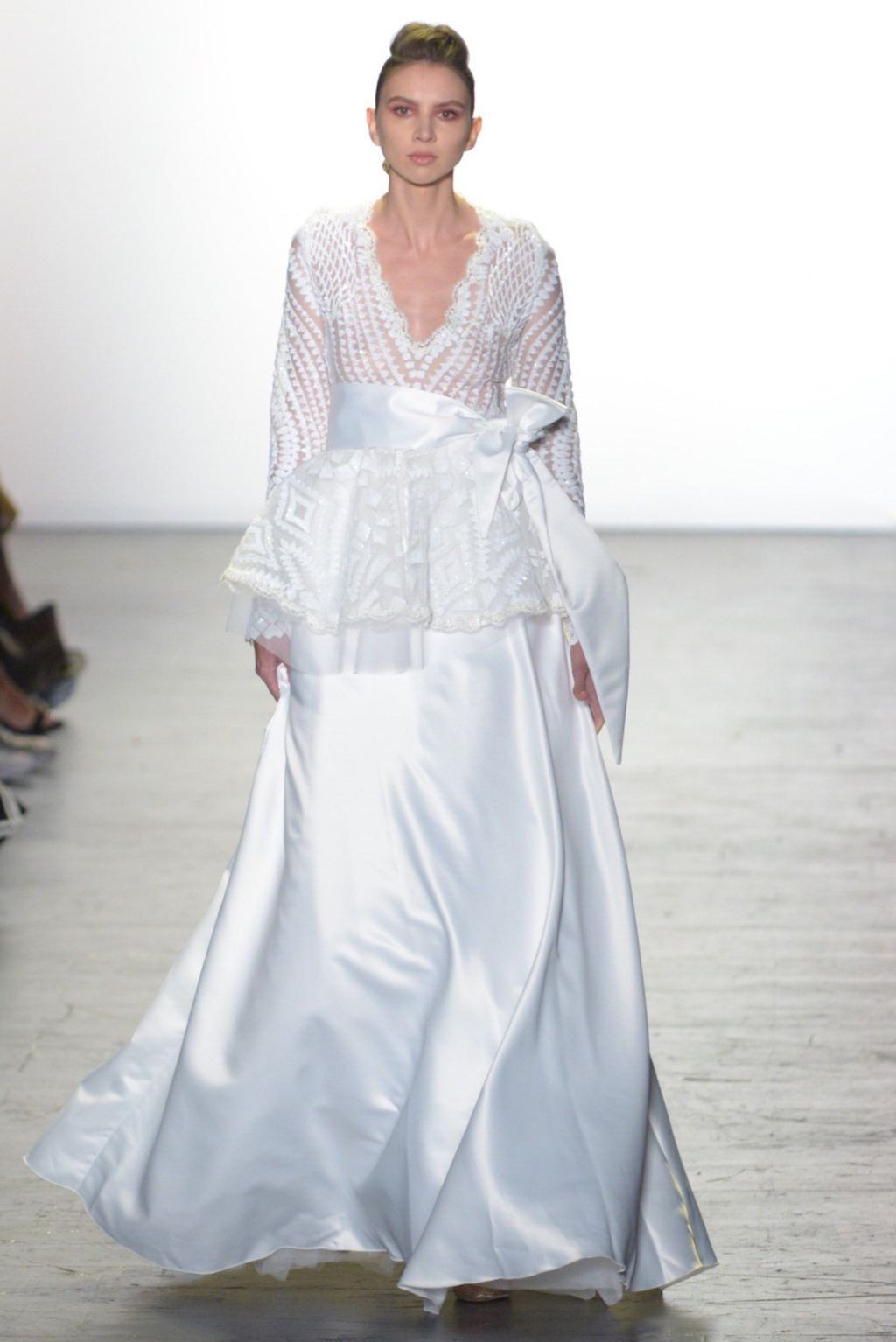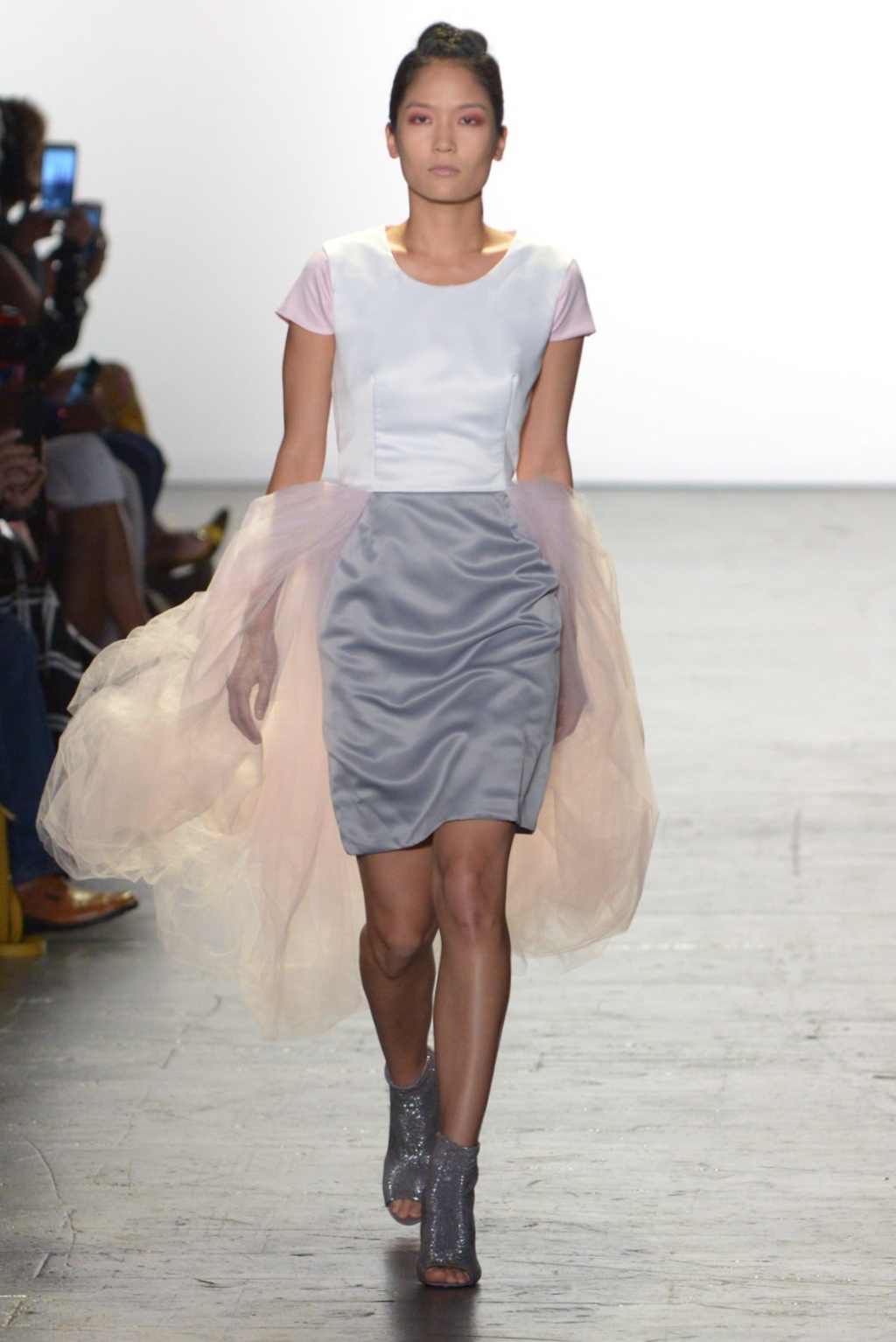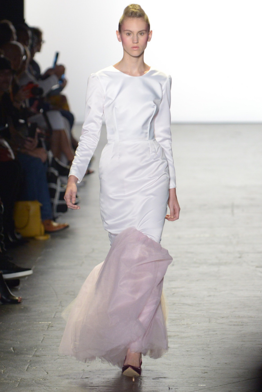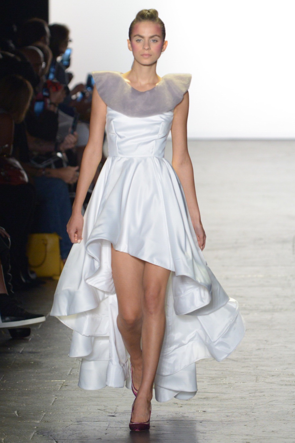 Rene Mejia’s collection was all about feminine romance. The looks were entirely made of satin and tulle and the designer played with the different properties of the two fabrics letting the satin give weight to designs while the pleated tulle fluttered down the runway.