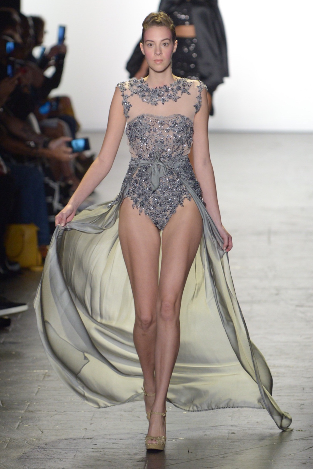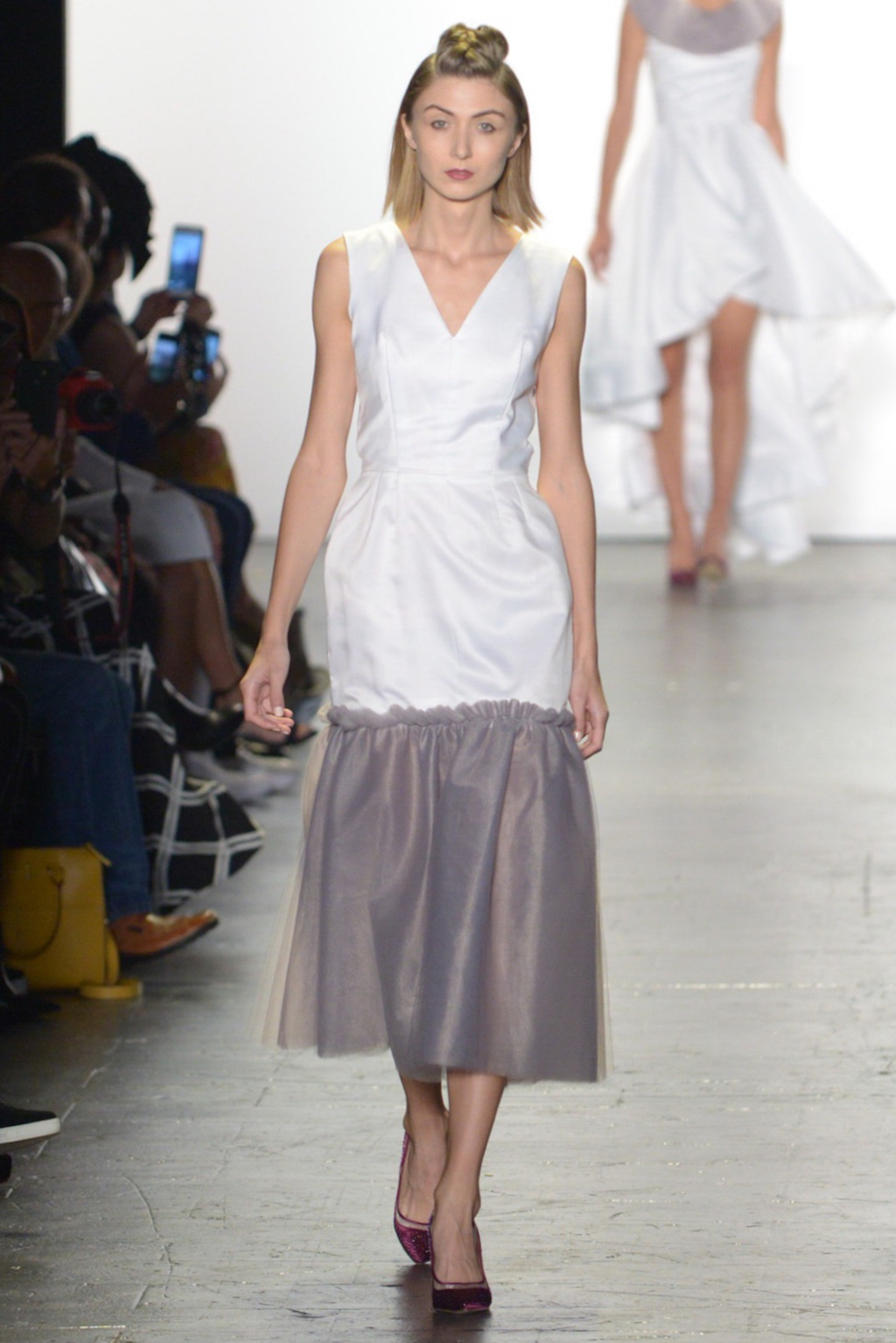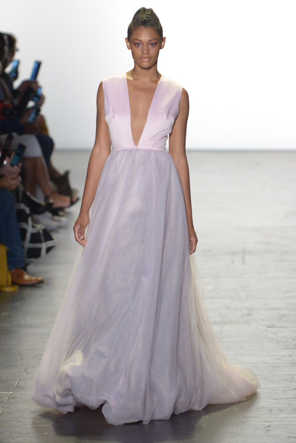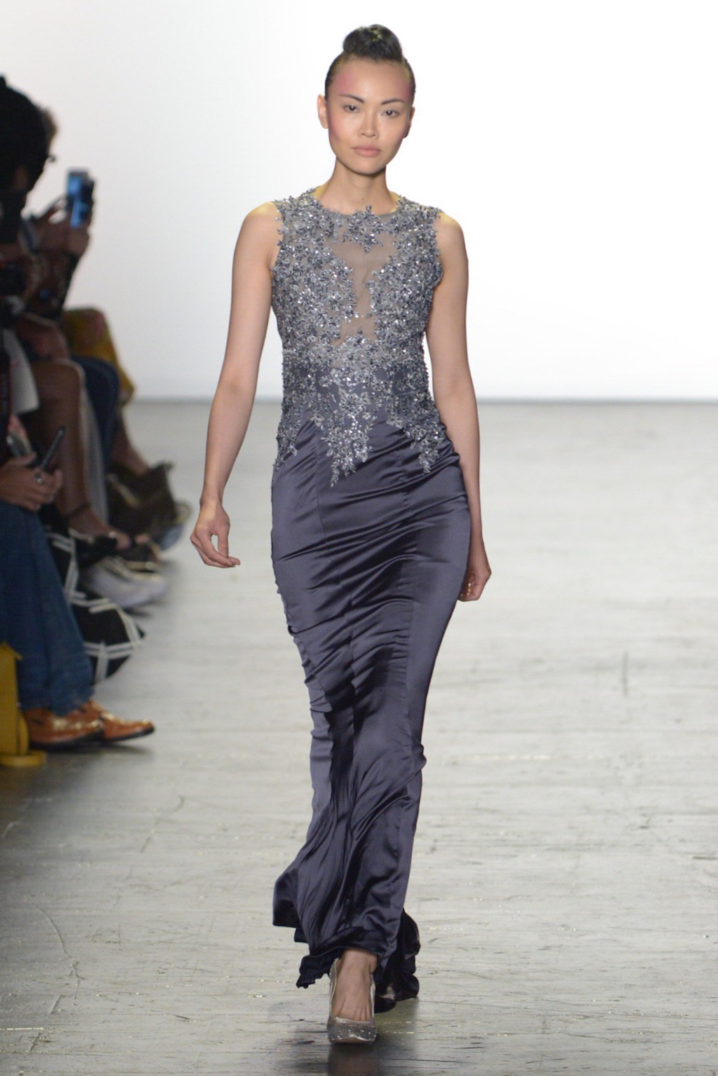 Rene Mejia’s collection was all about feminine romance. The looks were entirely made of satin and tulle and the designer played with the different properties of the two fabrics letting the satin give weight to designs while the pleated tulle fluttered down the runway.