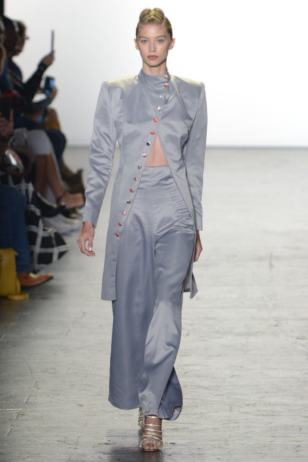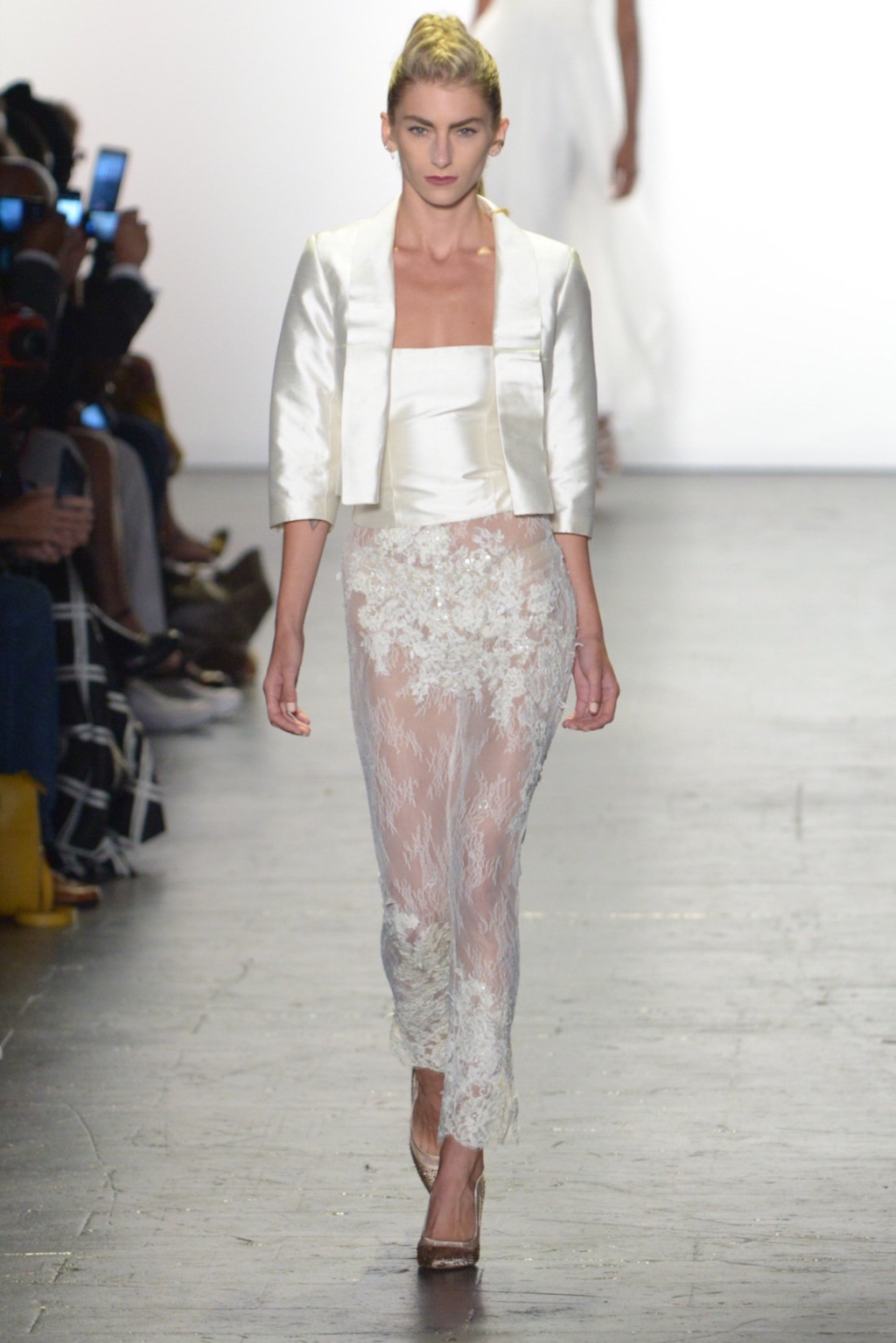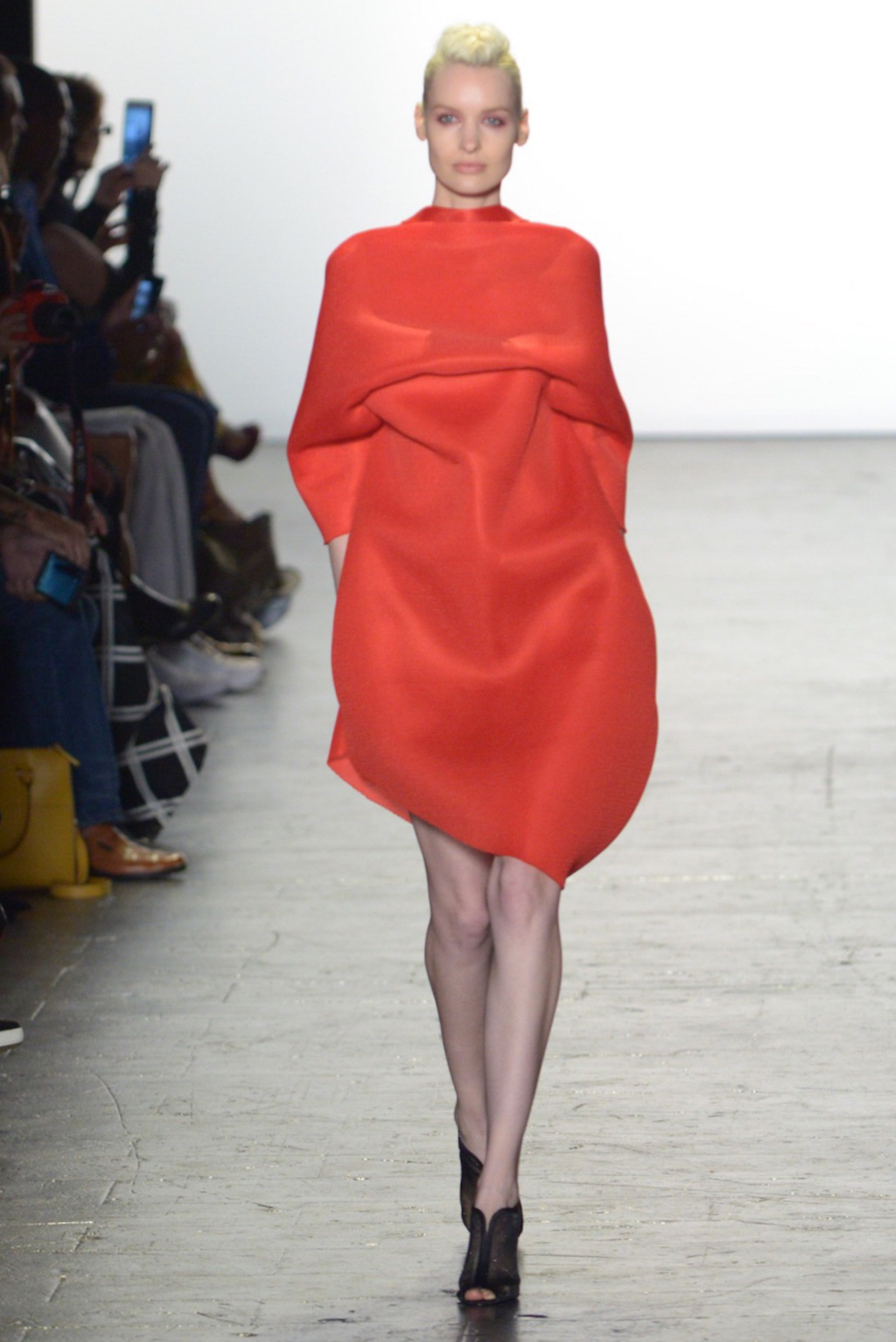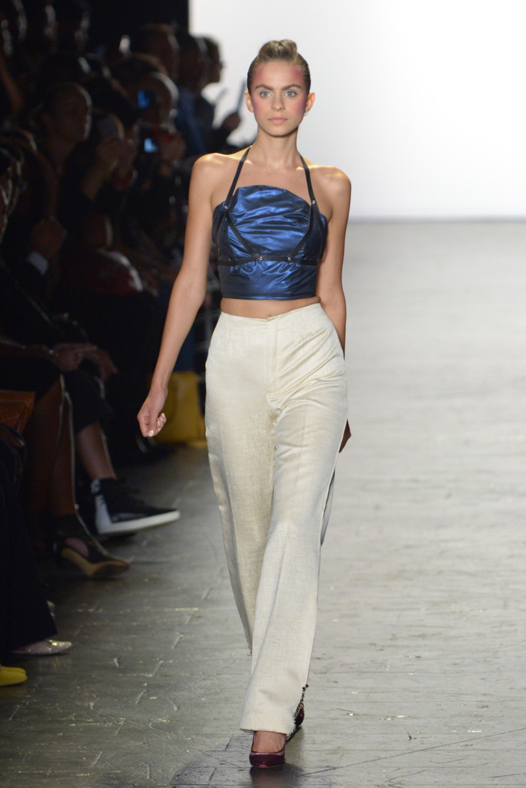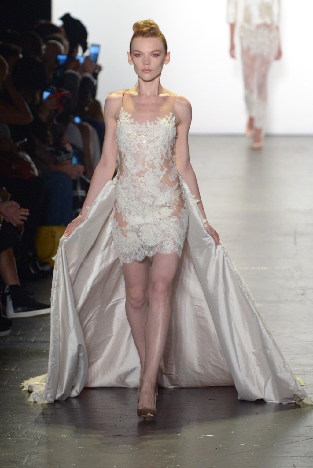 Rene Mejia’s collection was all about feminine romance. The looks were entirely made of satin and tulle and the designer played with the different properties of the two fabrics letting the satin give weight to designs while the pleated tulle fluttered down the runway.