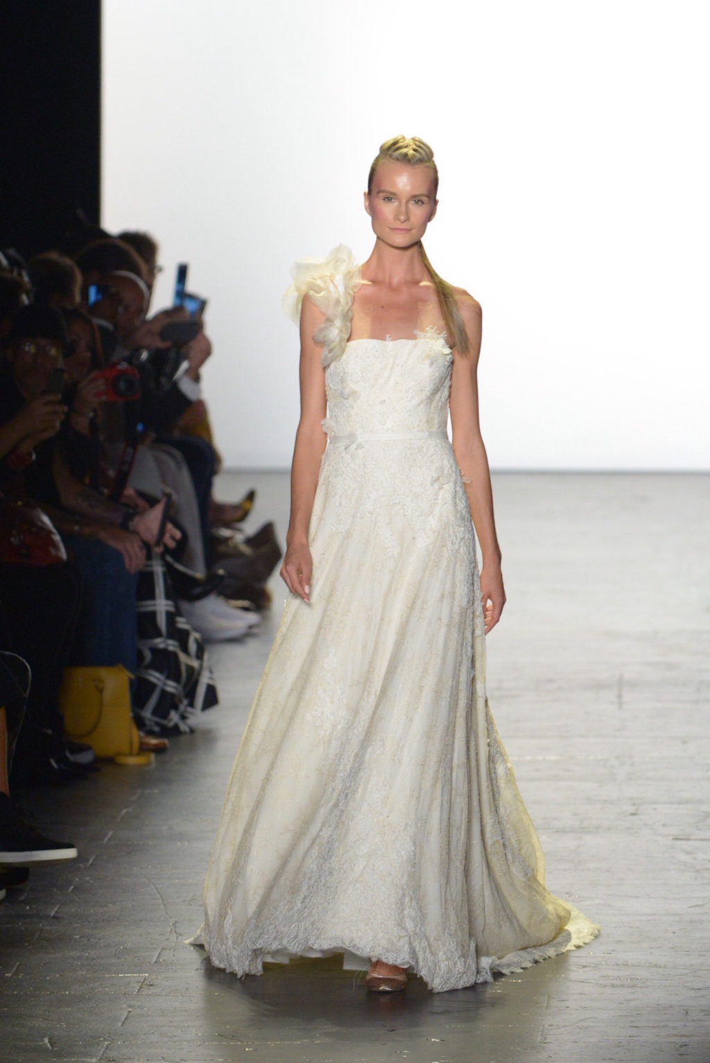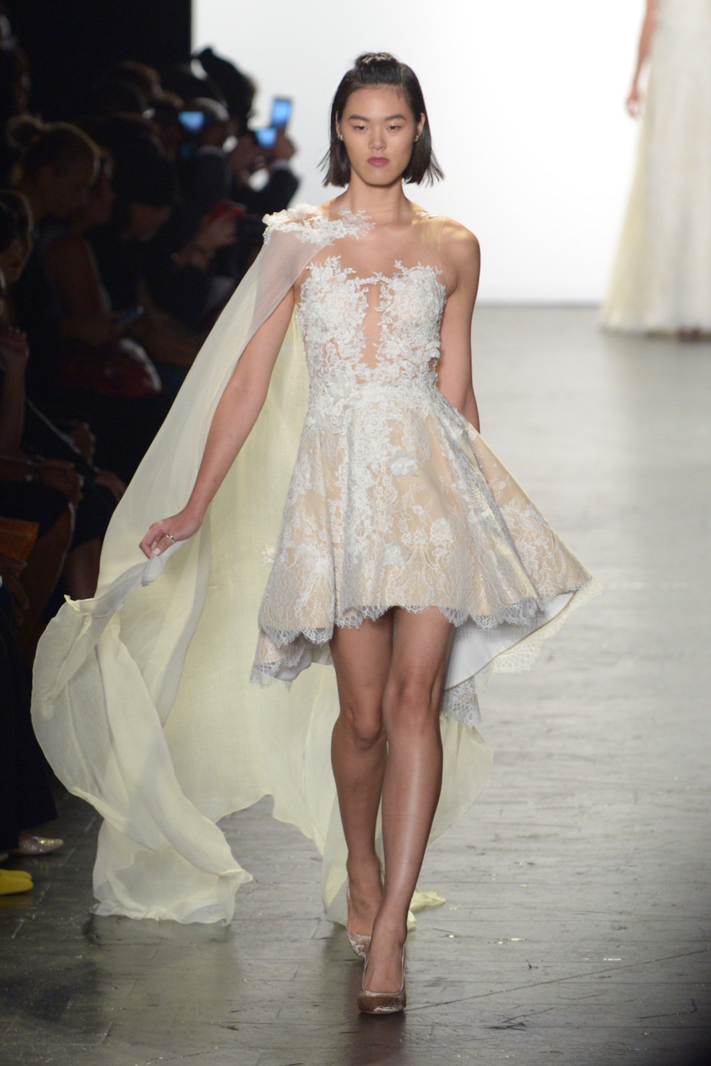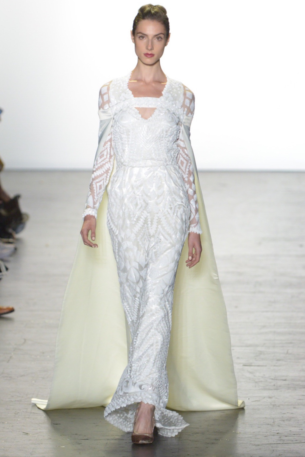To conclude, Maria D’Ocon presented a bridal collection that was decidedly on trend. The beautifully embellished gowns featured three dimensional lace and beading. The two standouts were the bridal pants suit and the bridal cape that billowed down the runway.
