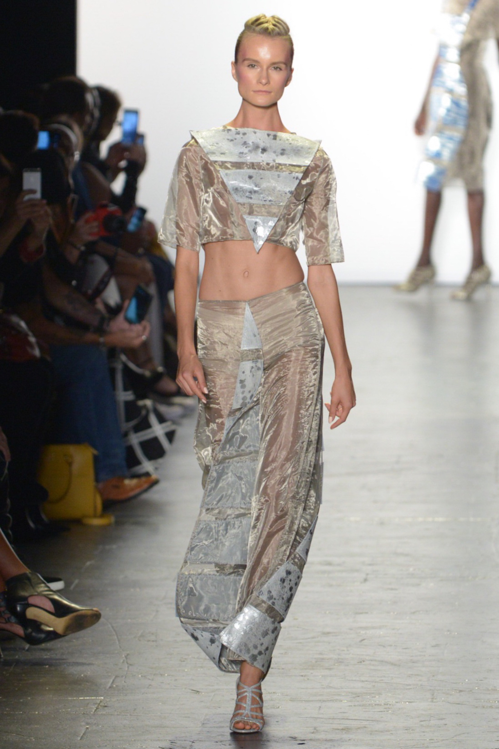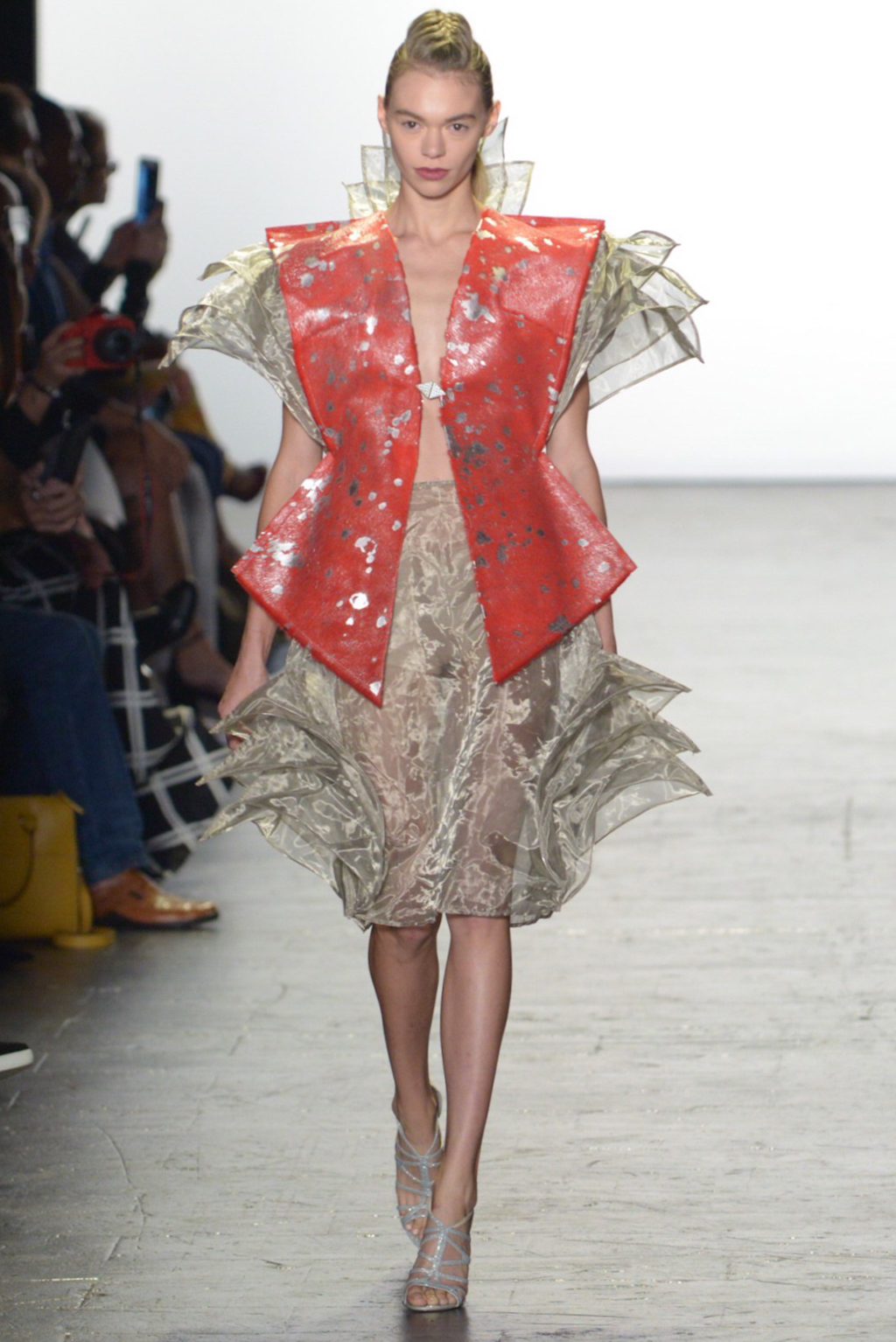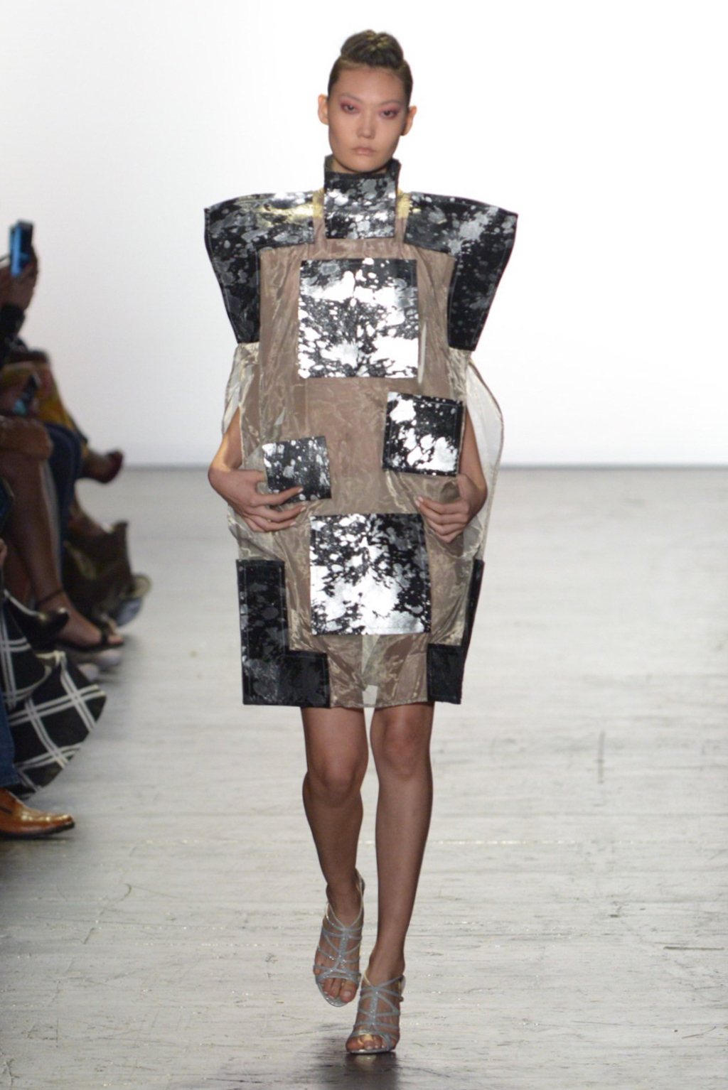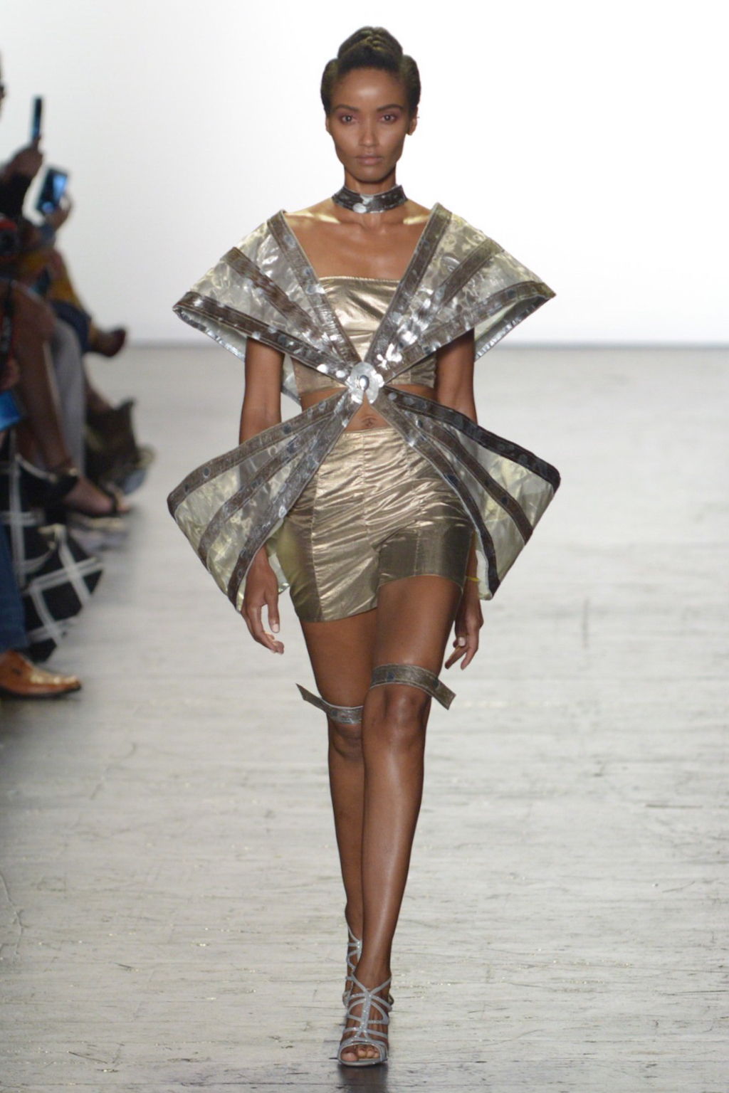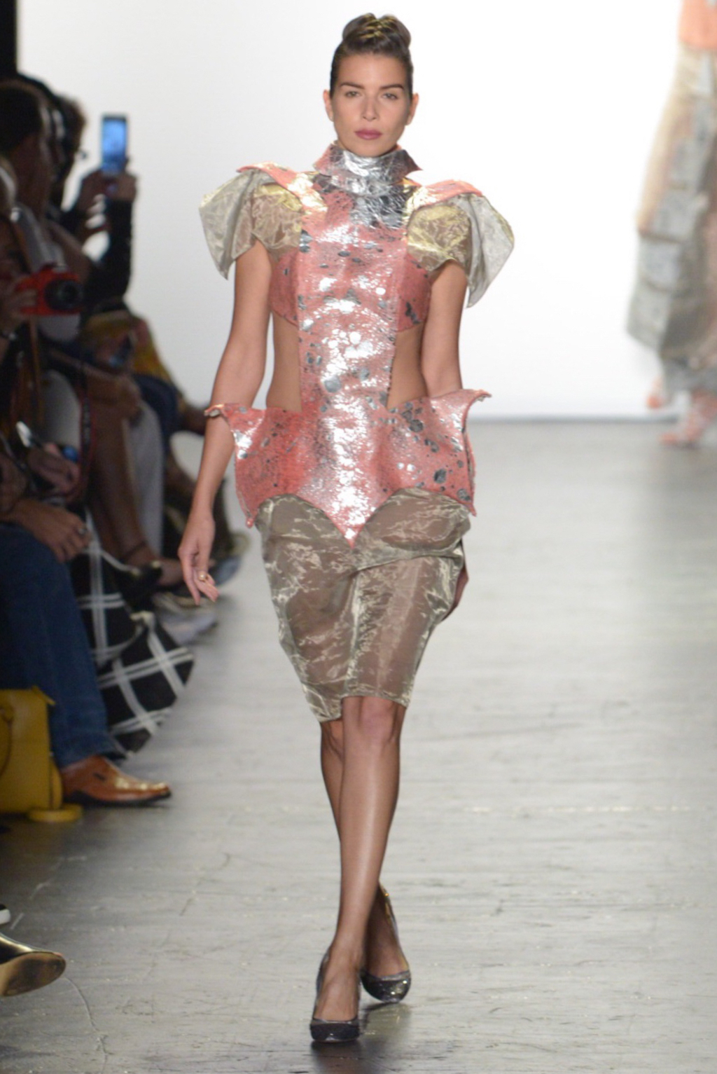 Mimmy Begazo’s collection was a futuristic take on the 80s. The silhouettes were reminiscent of the power suits of the era with exaggerated hips and shoulders shown in the collection. Metallic foil printed leather gave a unique spin paired with the organza that comprised most of the collection.