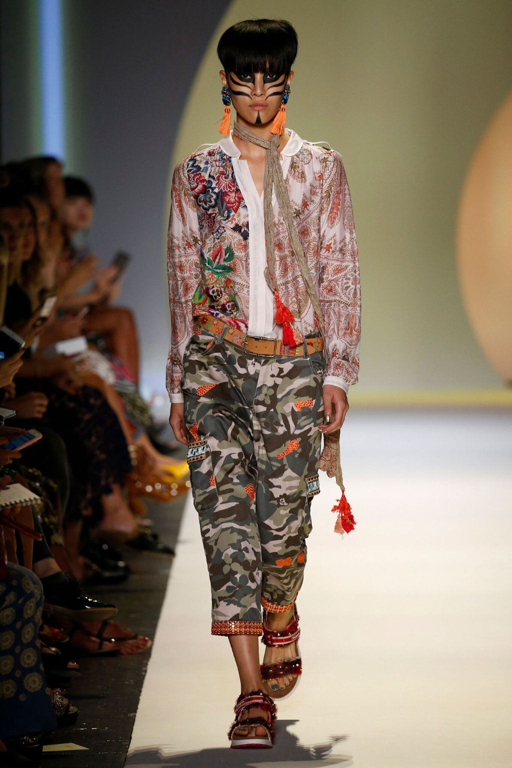 Variety is always a key element for Desigual collections. Bold ethnic patterns and crystalline appliqué work made denim cropped jackets pop with light and color. Bohemian-chic chambray maxi dresses were artfully paired with embellished denim vests and leather jackets. Military-inspired olive bomber jackets were feminised with floral patterns and paired with bedazzled berets. Light cotton skirts flowed elegantly as vegan leather pom-pom satchels bounced in rhythm on models’ hips.