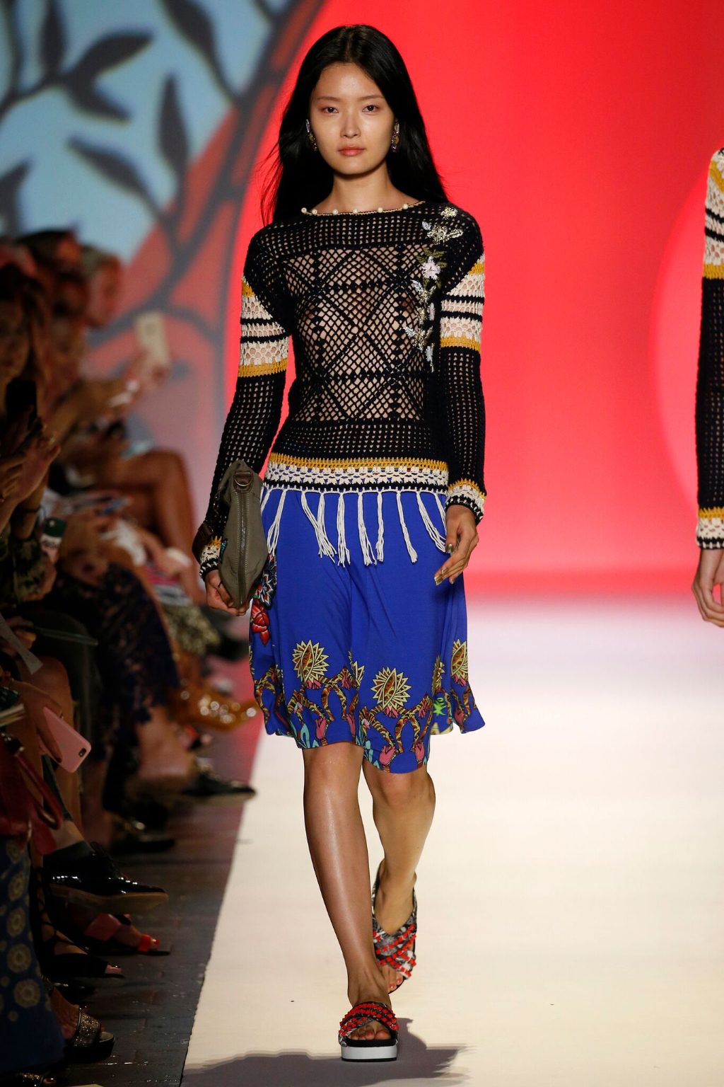 The plastic-covered dual runways in the Arc Pavilion at Moynihan Station, waiting to be uncovered, lay bathed in an array of purple and gold light before being trampled on by a multitude of roaming fashionistas. Rushing in from the hot September Thursday outside, onlookers filed in for Desigual’s spring/summer 2017 runway show. The show aptly titled, Global Traveller sent paired models on an extensive runway expedition, pumped with youthful energy and bold color. A global bazaar of textures, patterns, and accessories ensued.