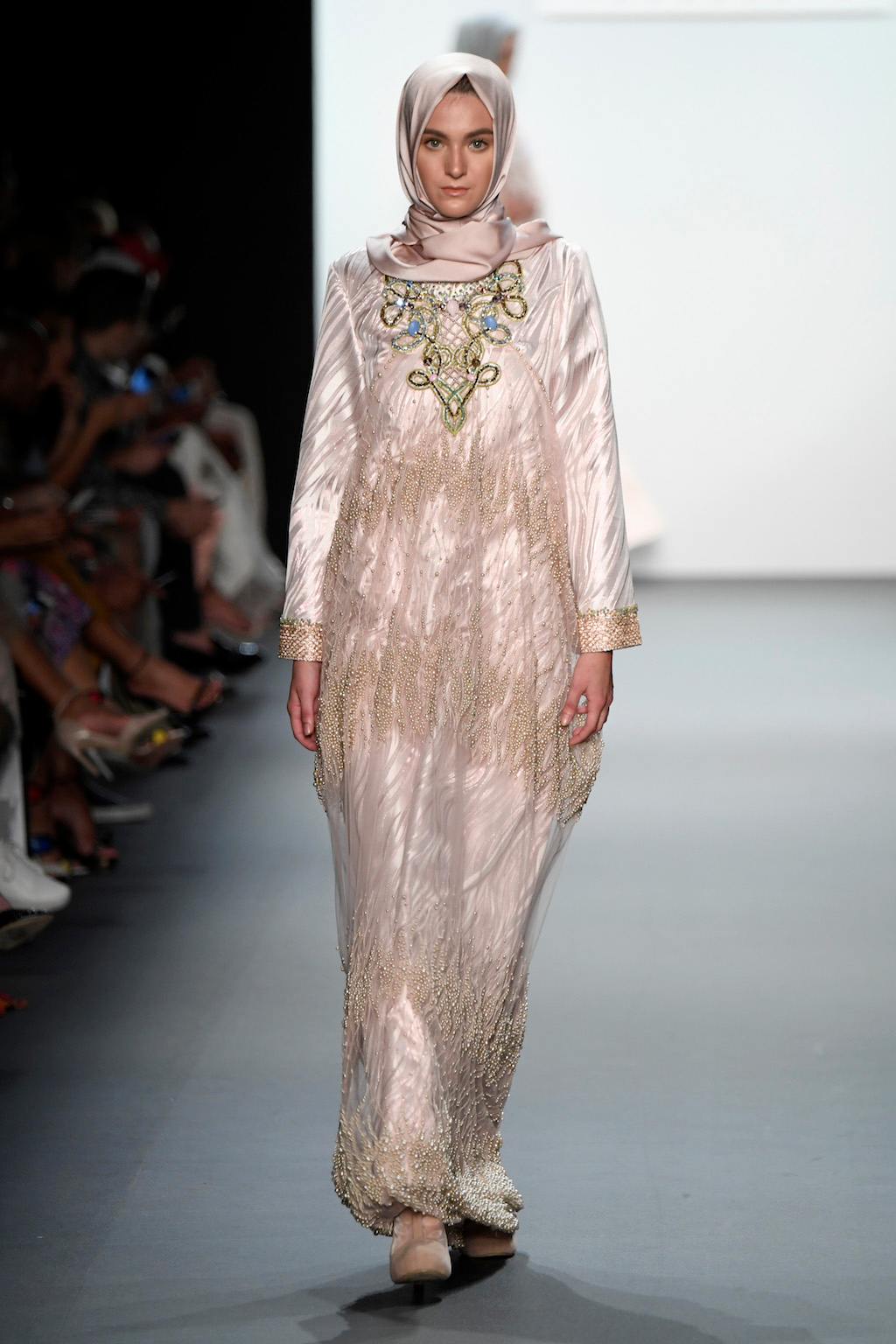 The show completed its circulation with a number of multi-layered jewel-laden pieces in an brighter array of colours than previously showed, and lights dimmed. The shaded figure of the model in Anniesa’s final look made her way to the centre of the top of the runway in silhouette, two assistants in tow to fan out her train. The light came back up to the audible excitement of the spectators. The model walked forward, arms outstretched to greet her adoring public in an elaborate, gold-trimmed white gown complete with pearl studded veil. Her extended walk effused the true wealth and expanse of the collection. An assistant was spotted backstage crying with relief.