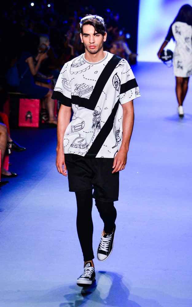 The show opened with a definite Asian-flair. Animation-style graffiti prints dominated the collection, covering everything from track suit tops to children’s jackets. Models came out paired with racer helmets bearing the company’s gorilla logo.