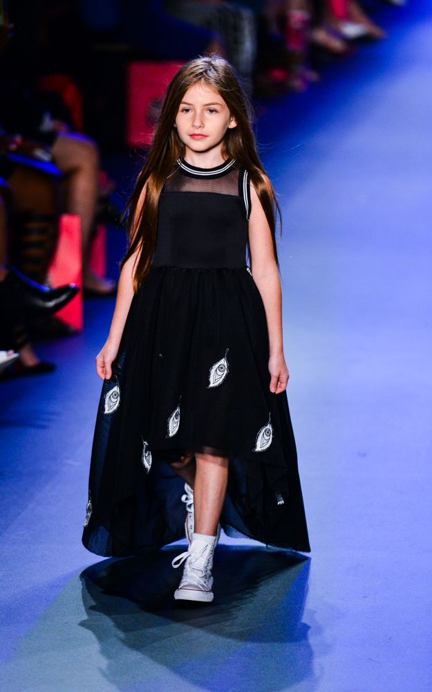 A buzz came over the audience every time a pint-sized model made their way sheepishly down the runway, but with a subtle air of fascination. One such model wore a sporty white jacket with a white netting ruff adorning the shoulders.