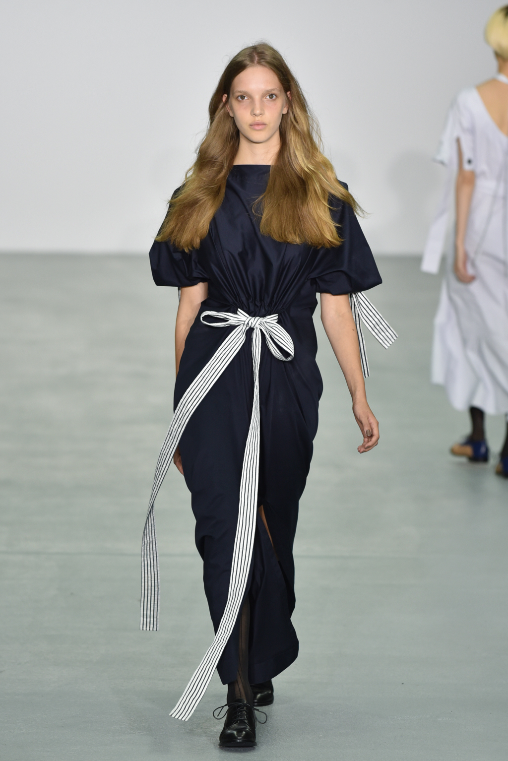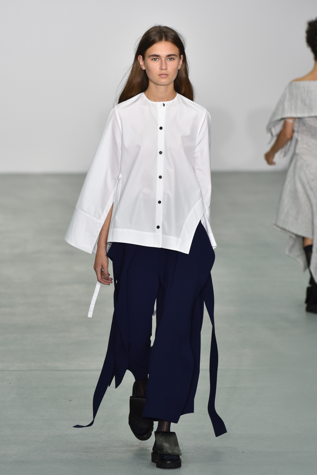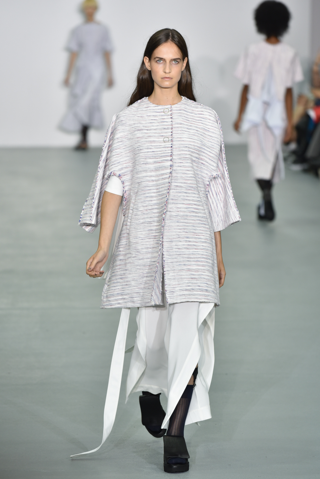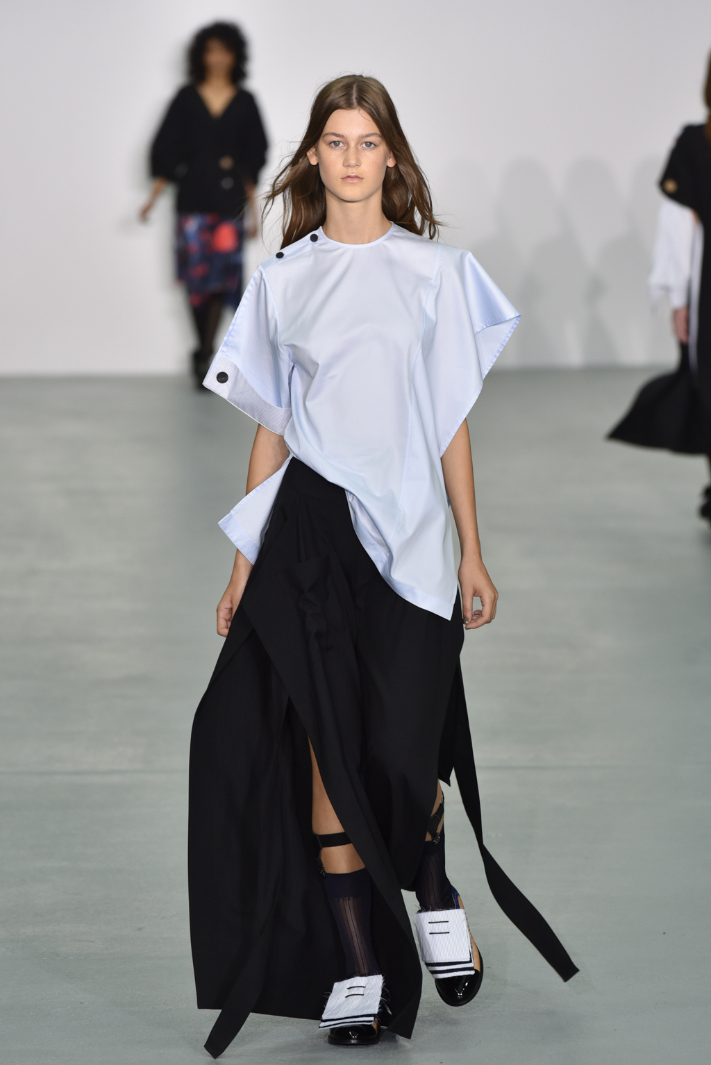 Since his LFW debut in 2012, Eudon Choi has made a name and label for himself by utilising his tailoring training in the womenswear sphere. His collections have historically deployed a small number of fabrics and prints to subvert our understanding of womenswear designs; unsurprisingly, his SS17 collection continues – but also extends – this trend. It seems SS17 for Choi is all about celebrating how fabrics fall on the wearer.